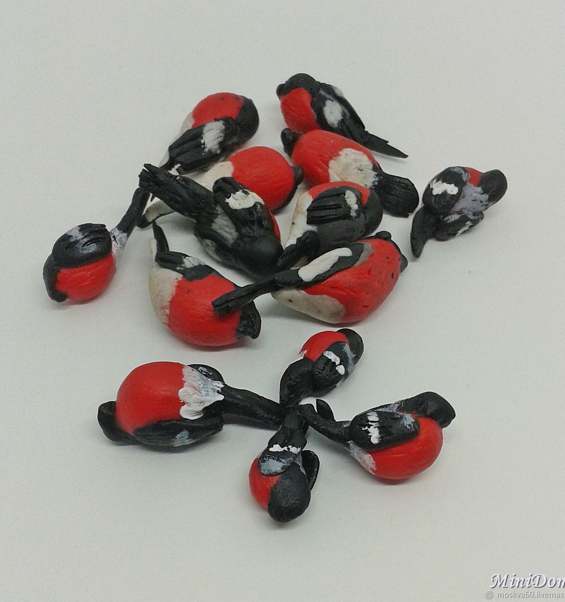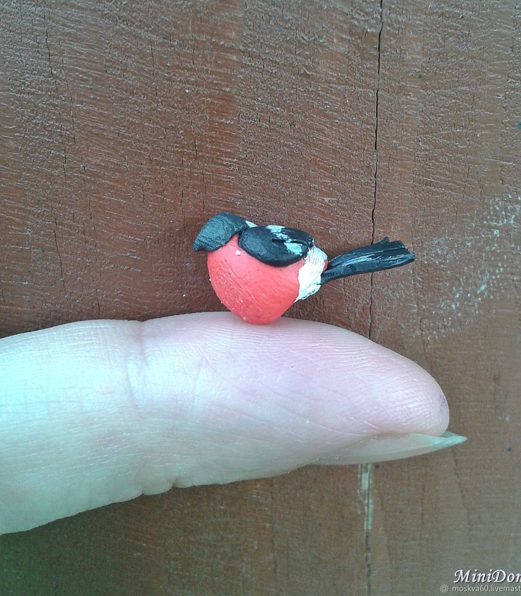 Снегирь - миниатюрная птичка выполнена полностью вручную из полимерной глины различных цветов. Вручную раскрашены только спинка, полоски на крыльях и белое пятно под хвостиком.