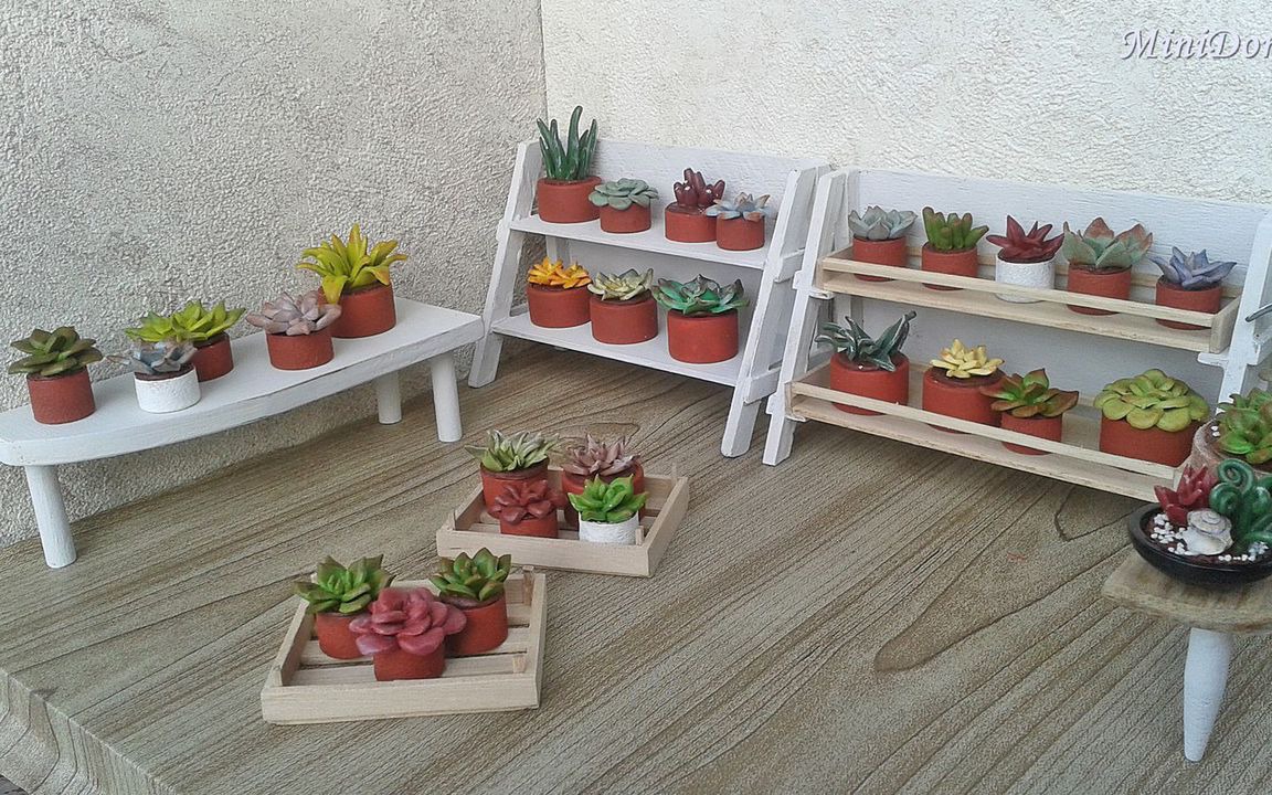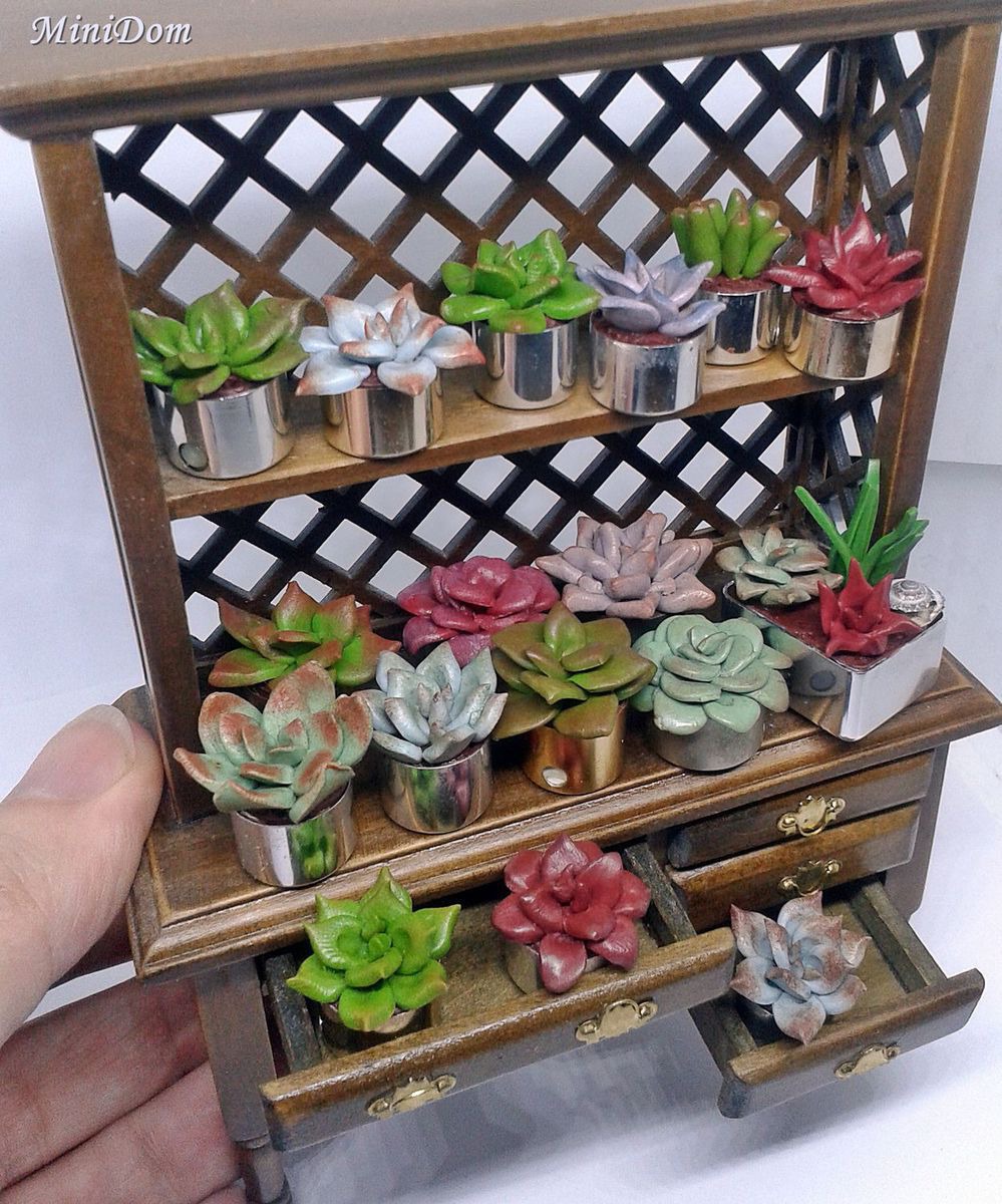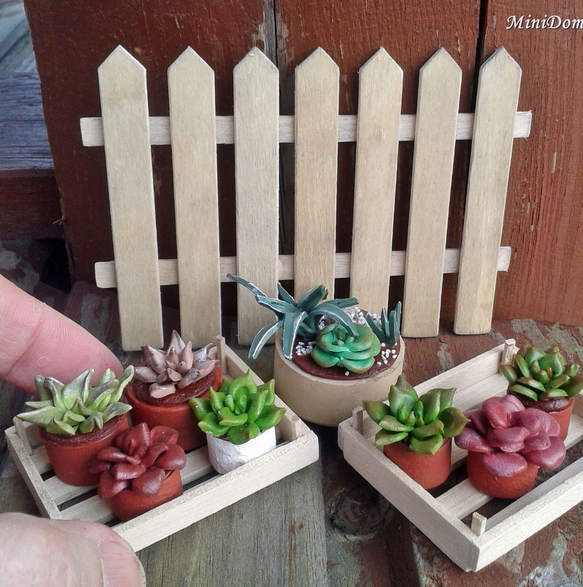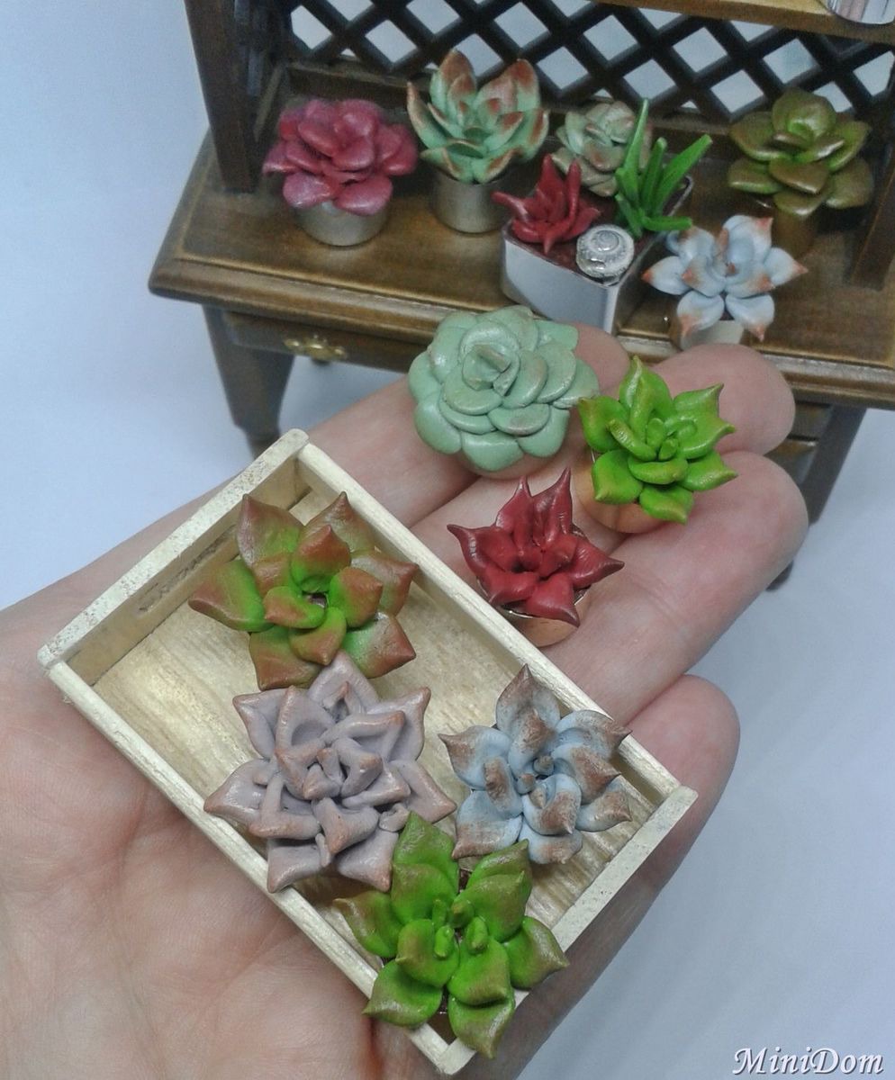 Такие миниатюрные аксессуары могут использоваться и в минисадиках, и при оформлении интерьера кукольного домика, или цветочного магазинчика в масштабе 1 к 12, их можно поставить в деревянный ящик, как на четвертом фото и использовать в качестве магнита на холодильник. Также такие кукольные аксессуары являются предметом коллекционирования. А еще Вы можете сделать необычный подарок любителю выращивать живые суккуленты.