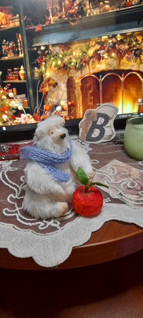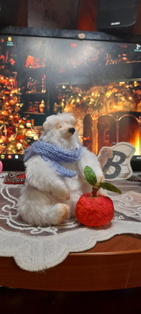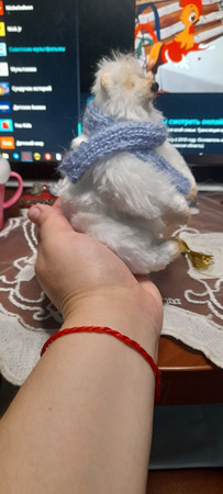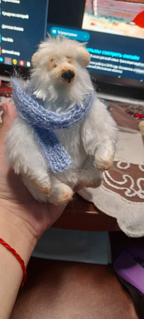 12 см мимимишности, обнимательный и тискательный..набит наполовину пряжей для валяния, что придает тепло и мягкость мишке.На пяти шплинтах.Материал: искусственный мех. У тяжелен минеральным гранулятом.
