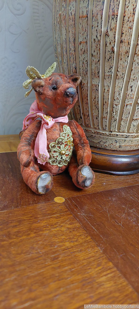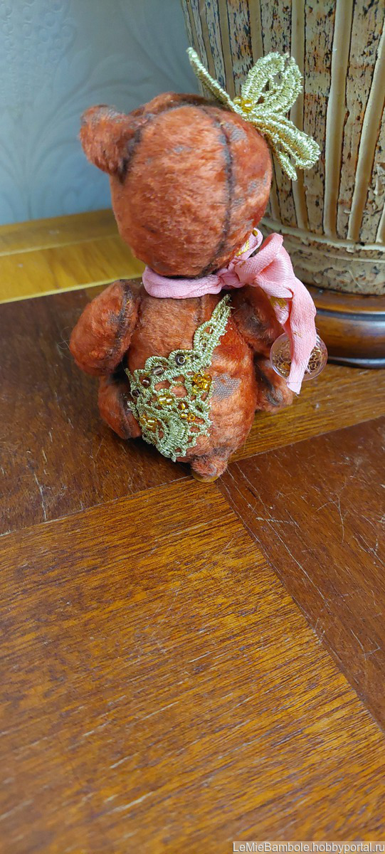 Маленькая Груня сшита из старенького винтажного плюша (СССР), по технологии мишек Тедди, по авторской выкройке. На 6 шплинтах, набита опилками, утяжелена стеклянным гранулятом. Глазки стеклянные, тонирована художественной пастелью. Носик, ладошки и пяточки из натуральной лайковой кожи. Украшена кружевом, бисером и бусинами. Бант из шелка. Единственный экземпляр. Стоит только с опорой.