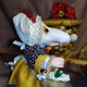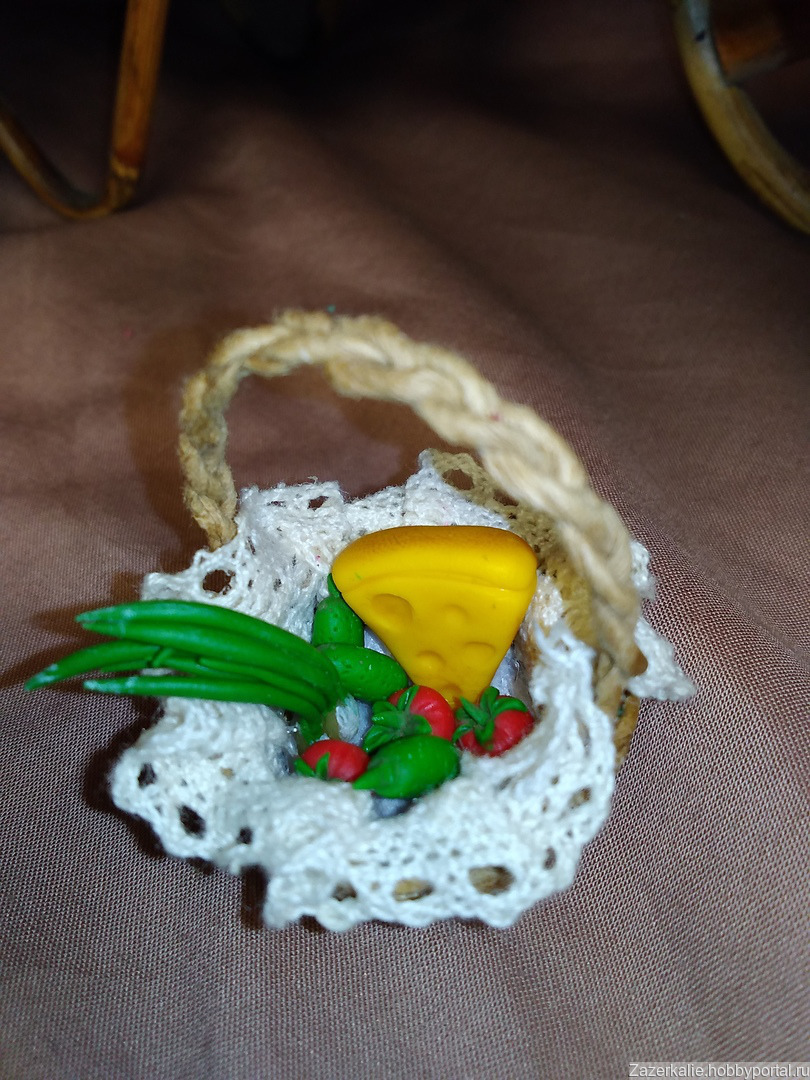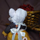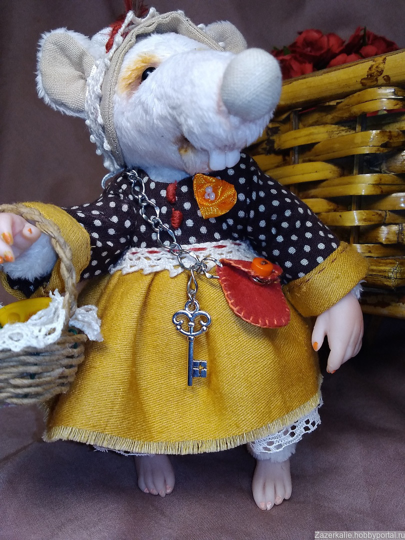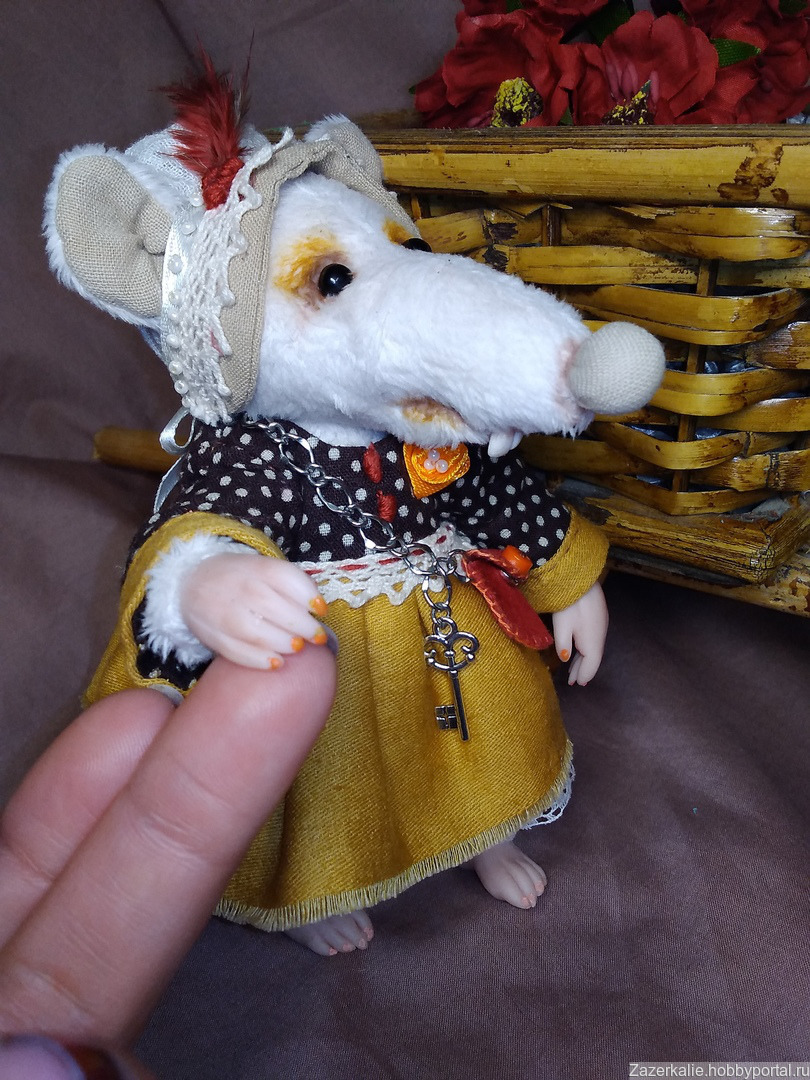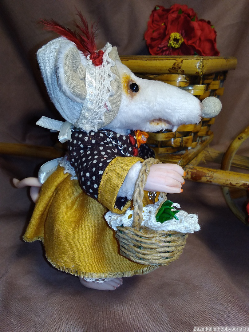 Крысочка ростом 15 см.Лапки, хвост, зубки сделаны из глины Living Doll, тело- мех искусственный, плотно набито синтепоном. Подвижная-голова на шплинтовом креплении, лапки нитяное. Стоит и сидит.Вся одежда съемная,натуральные ткани, кружево.В корзинке овощи(закреплены), сумочка открывается(на кнопке)