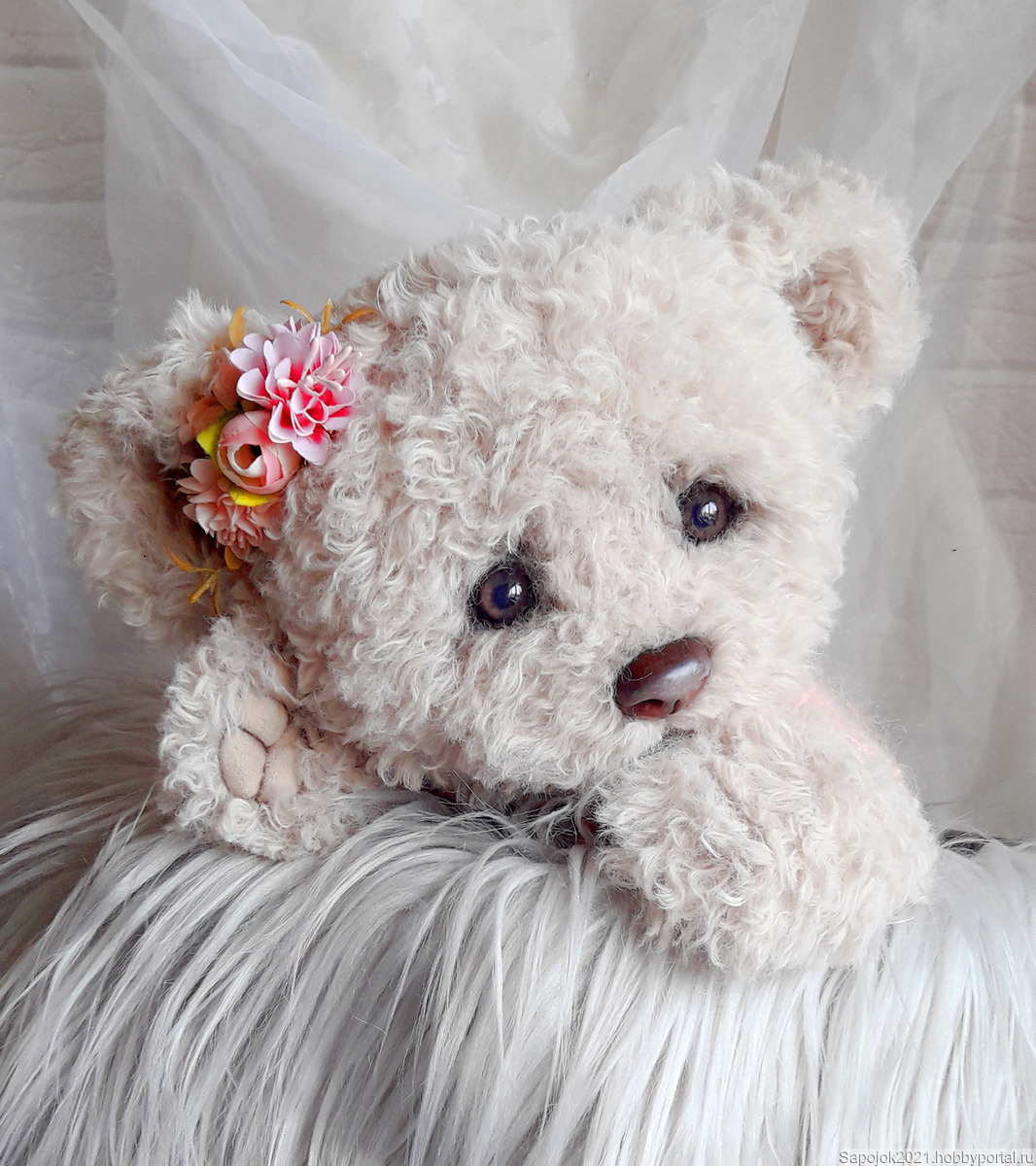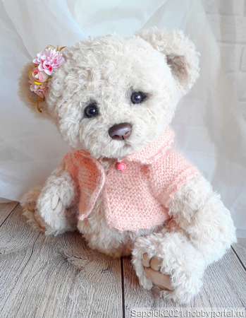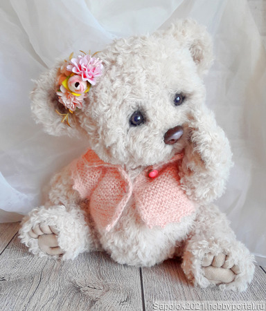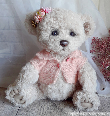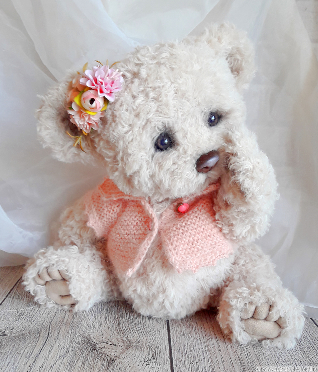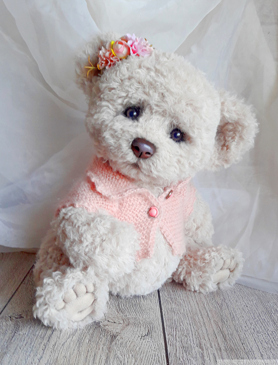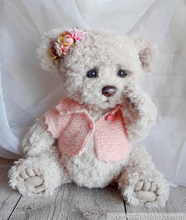 Мишутка ростом 43 см, выполнена из искусственного кудрявого меха. Все крепления подвижные (диски, шплинты) Наполнитель - синтепух. Тонирована художественной пастелью. В одежде использовалась натуральная мохеровая пряжа.