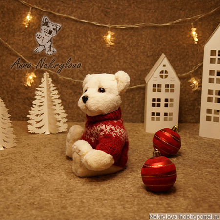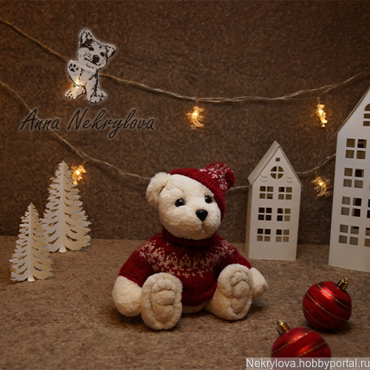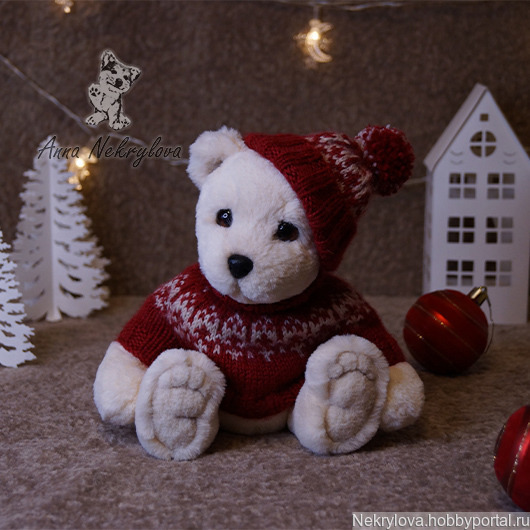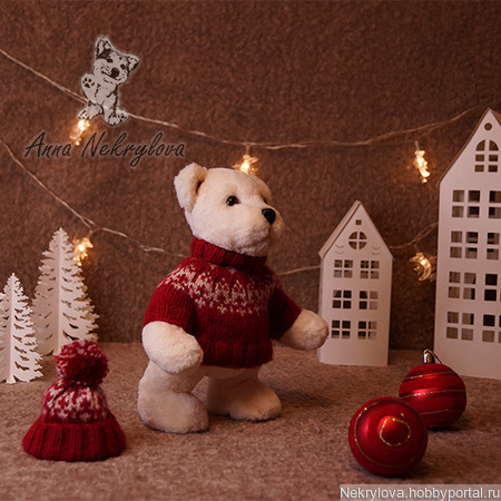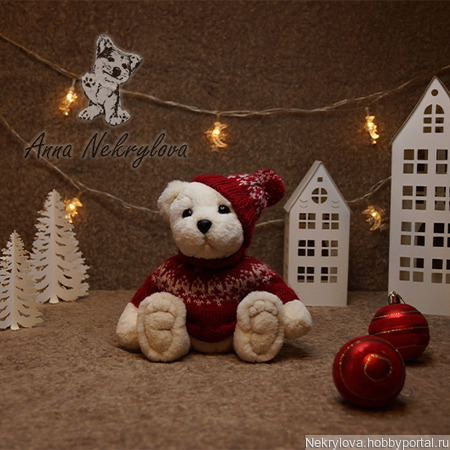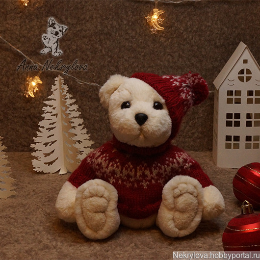 Мишутка выполнен из искусственного меха, тонирован сухой пастелью. Глазки стеклянные, носик из запекаемой пластики. Набивка - синтепон и стеклянный гранулят. Голова и лапы на шплинтовых шарнирах. Свитер и шапка связаны вручную из полушерстяной пряжи.
