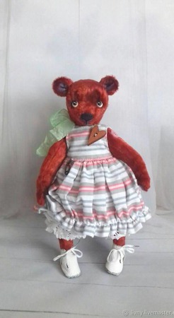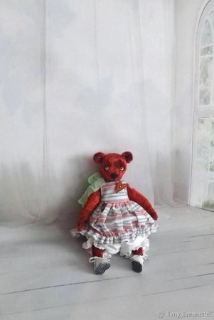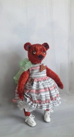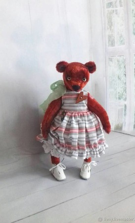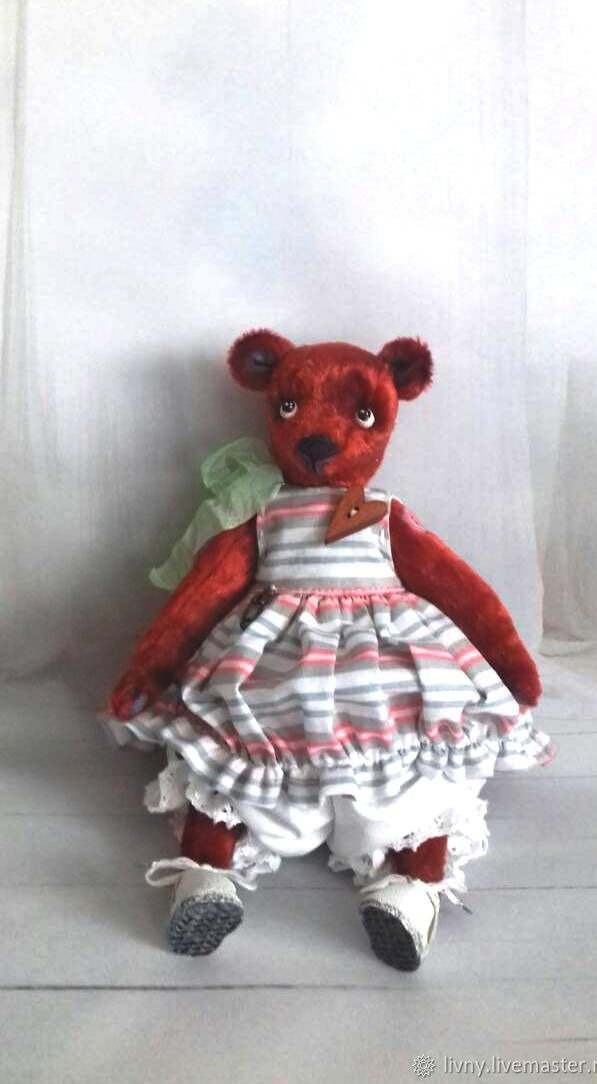 Мишка Фасолька сшита из бархатного плюша, накормлена нежнейшими опилочками. Фасолька одета в платьице и панталончики (хлопок и бязь). На лапках ботики, сделаны мной из кожзама. Одежда и обувь съёмные. Тонирована акрилом и пастелью. Мишка сшита по авторской выкройке Степановой Ани.