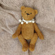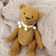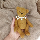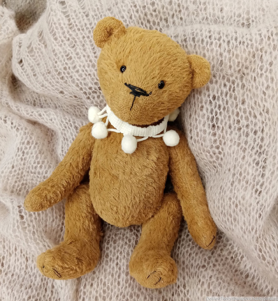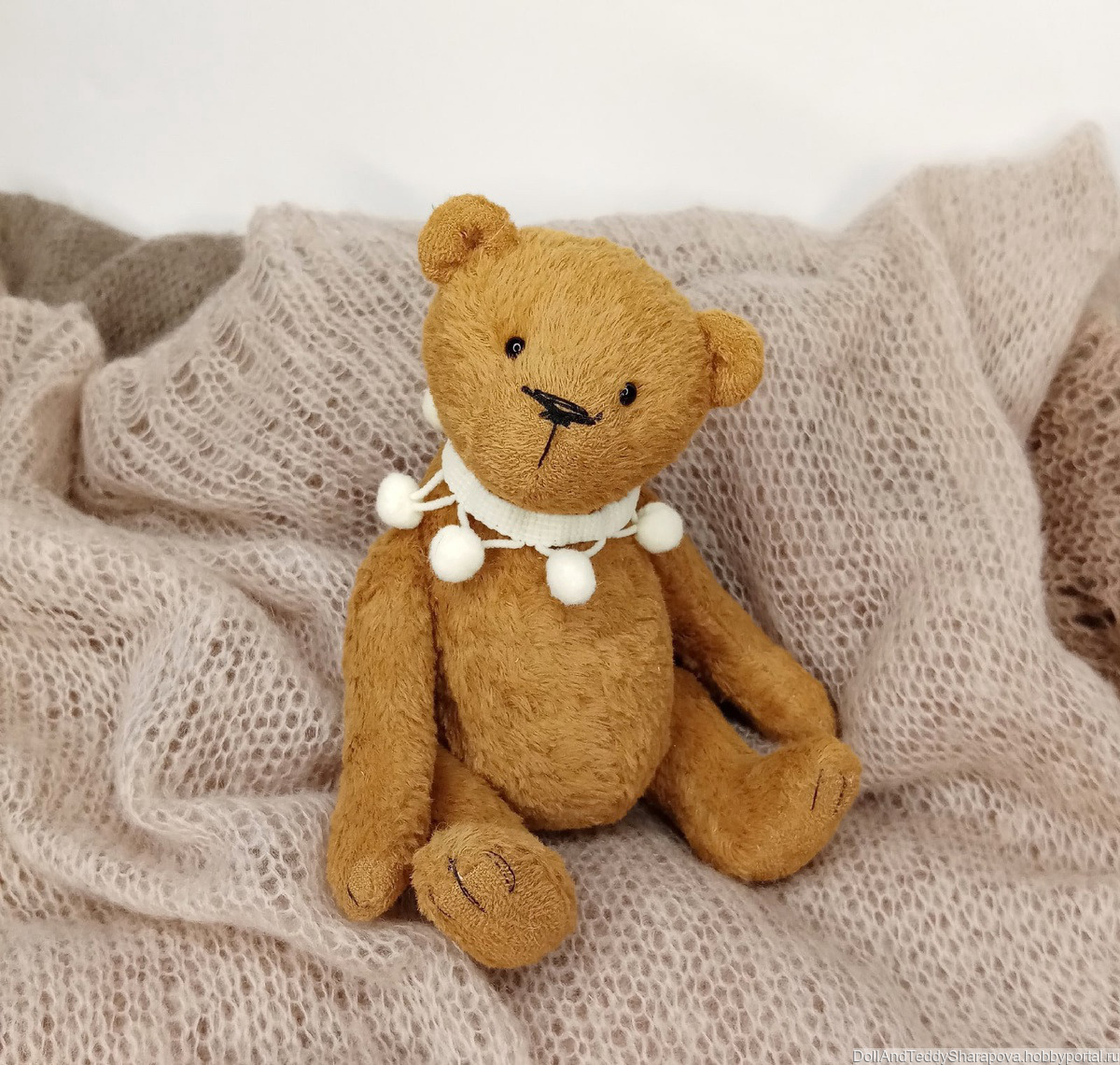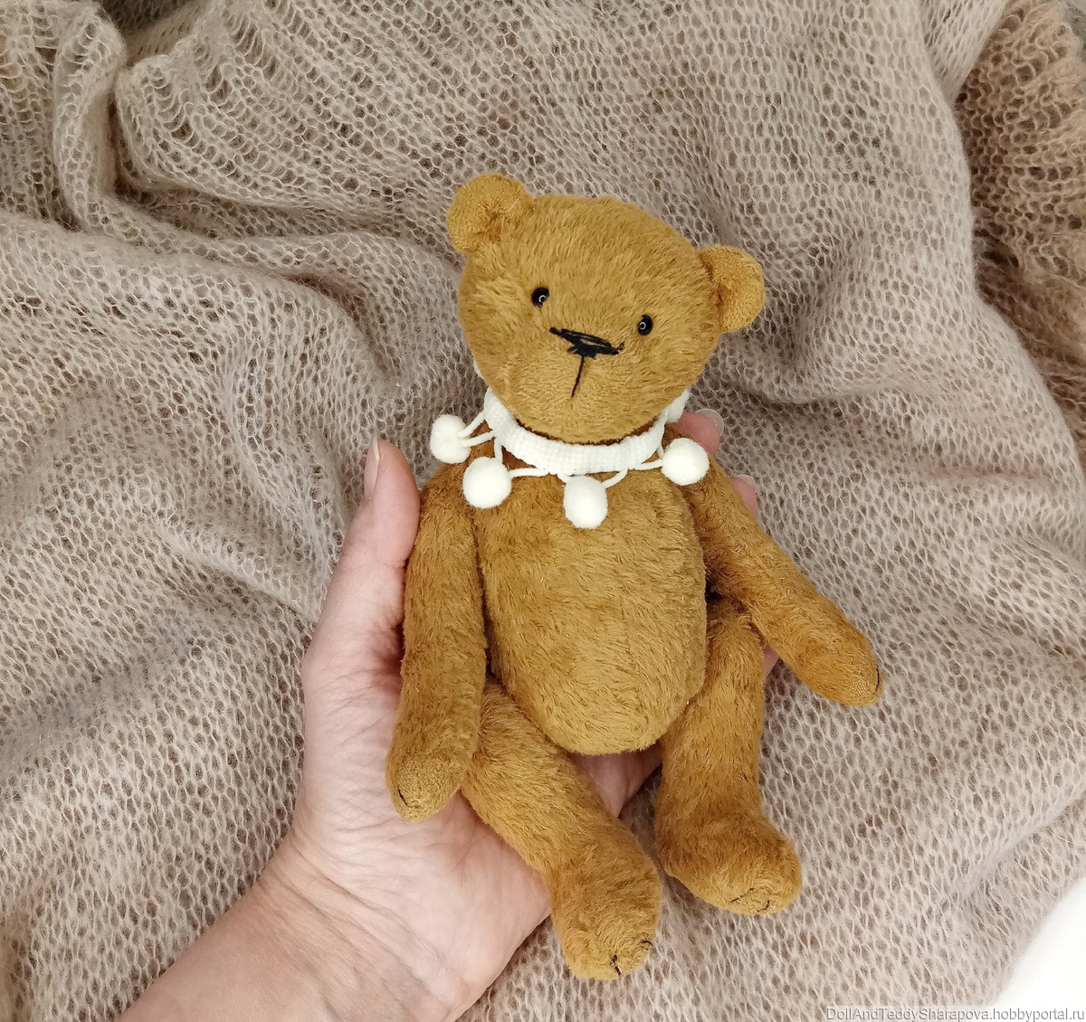 Мишка тедди сшит из вискозы, набит опилками и гранулятом. У мишки тедди лапы и голова вращаются. Глаза стеклянные. Ростом 19 см.