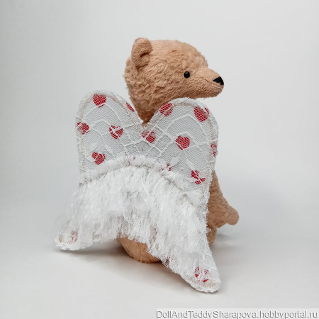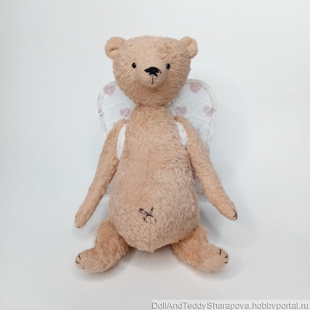 Мишка тедди сшит из вискозы, набит опилками и гранулятом. У мишки тедди лапы и голова вращаются. Глаза стеклянные. Крылья снимаются. Ростом 20 см.