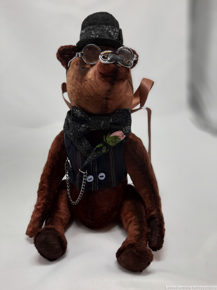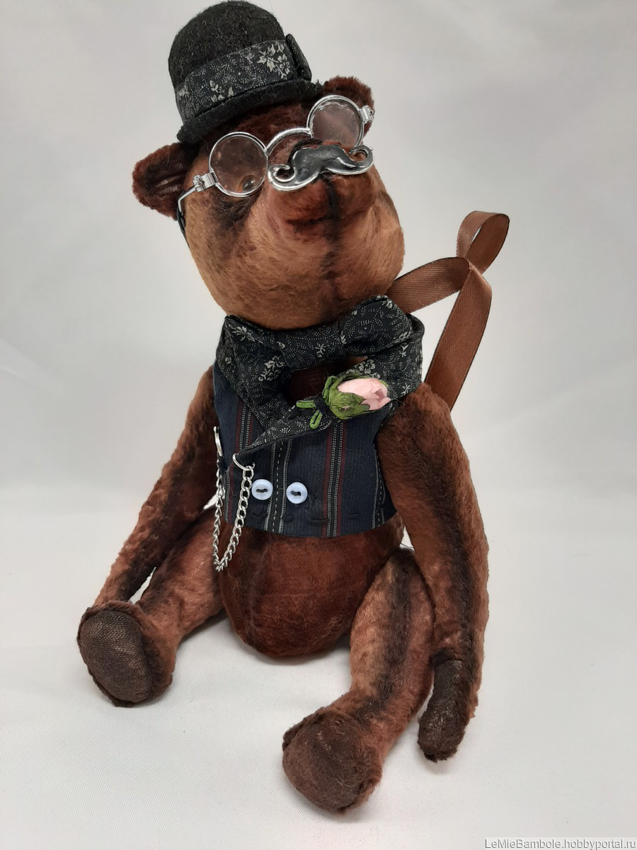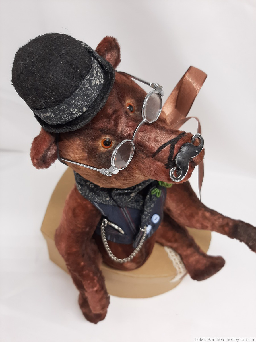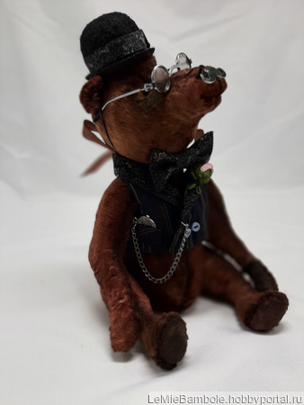 Мсье сшит полностью вручную по авторской выкройке, из винтажного плюша времен СССР, ручного окрашивания. На 8 шплинтах. Глазки - стекло (Германия). Ткань-компаньон - хлопок. наполнитель - опилки, утяжелен (мраморная крошка). Деликатно состарен. Вместо хвостика - пуговка с раскопок. Тонирован пастелью и сангиной. Сам не стоит (технологические особенности выкройки), может стоять с опорой, ножки и тельце набиты менее плотно. Шляпа-котелок изготовлена вручную из фетра, украшена лентой из хлопка (снимается). Очки стеклянные. Усики из окрашенного металла.