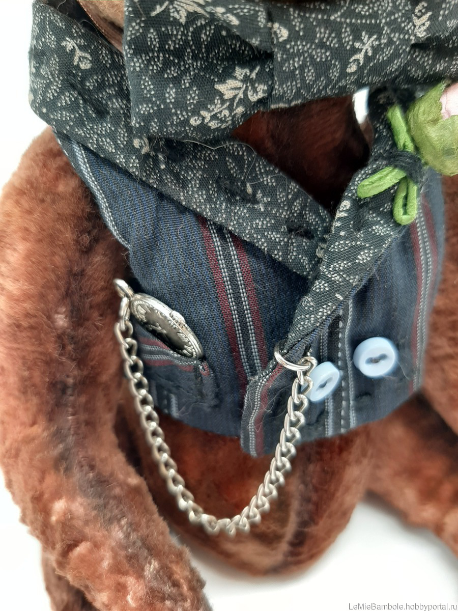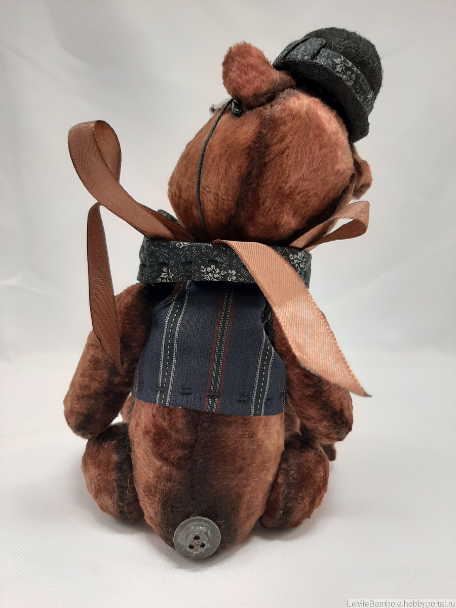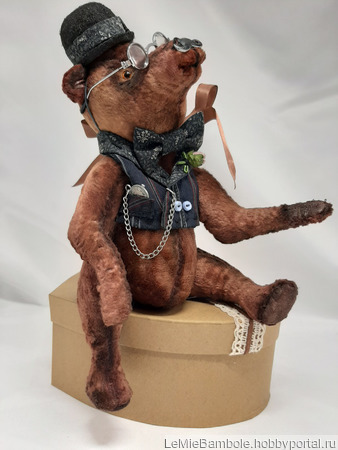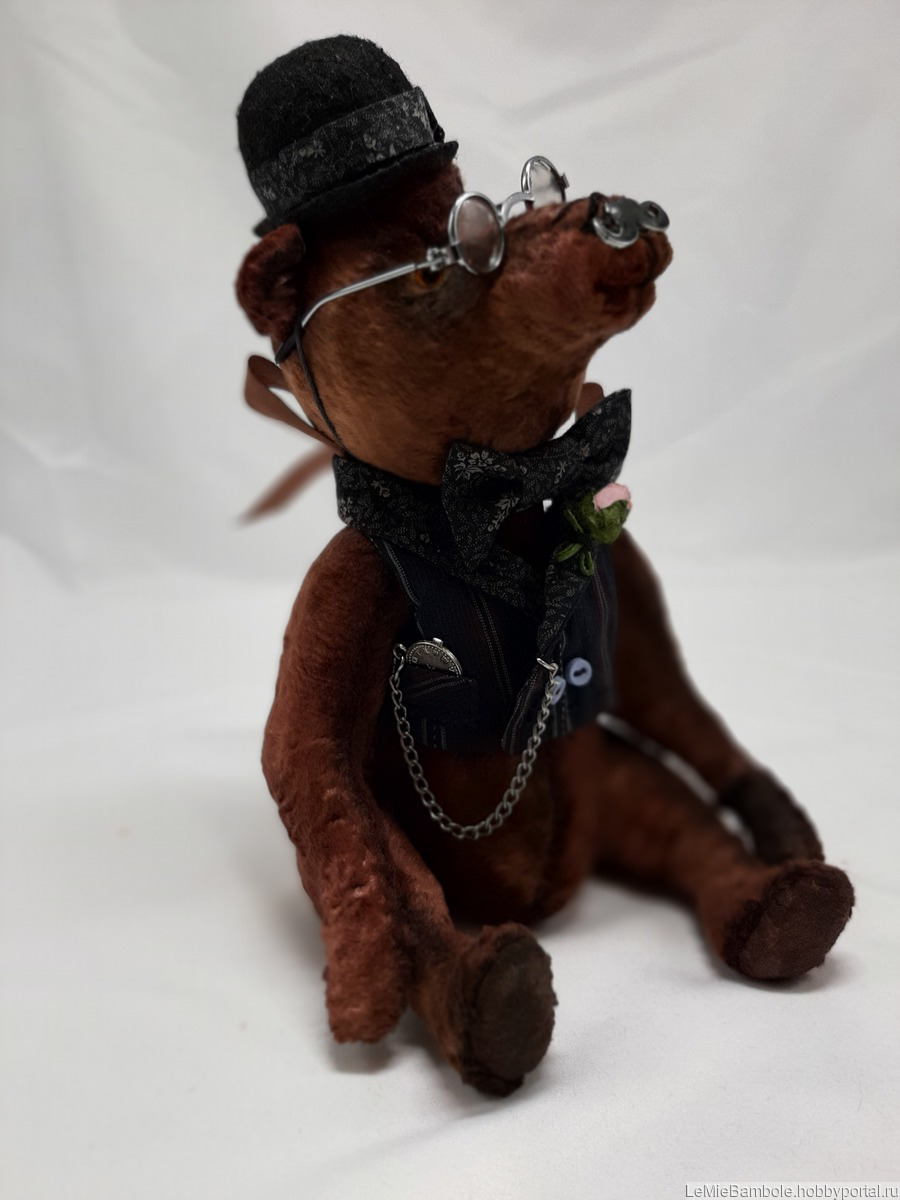 Мсье сшит полностью вручную по авторской выкройке, из винтажного плюша времен СССР, ручного окрашивания. На 8 шплинтах. Глазки - стекло (Германия). Ткань-компаньон - хлопок. наполнитель - опилки, утяжелен (мраморная крошка). Деликатно состарен. Вместо хвостика - пуговка с раскопок. Тонирован пастелью и сангиной. Сам не стоит (технологические особенности выкройки), может стоять с опорой, ножки и тельце набиты менее плотно. Шляпа-котелок изготовлена вручную из фетра, украшена лентой из хлопка (снимается). Очки стеклянные. Усики из окрашенного металла.