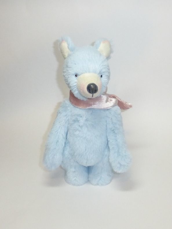 Мишка сшит из длинноворсового искусственного меха по всем правилам тедди. 5 подвижных креплений, стеклянные глазки, набит опилочками. На шее бархатный шарфик.