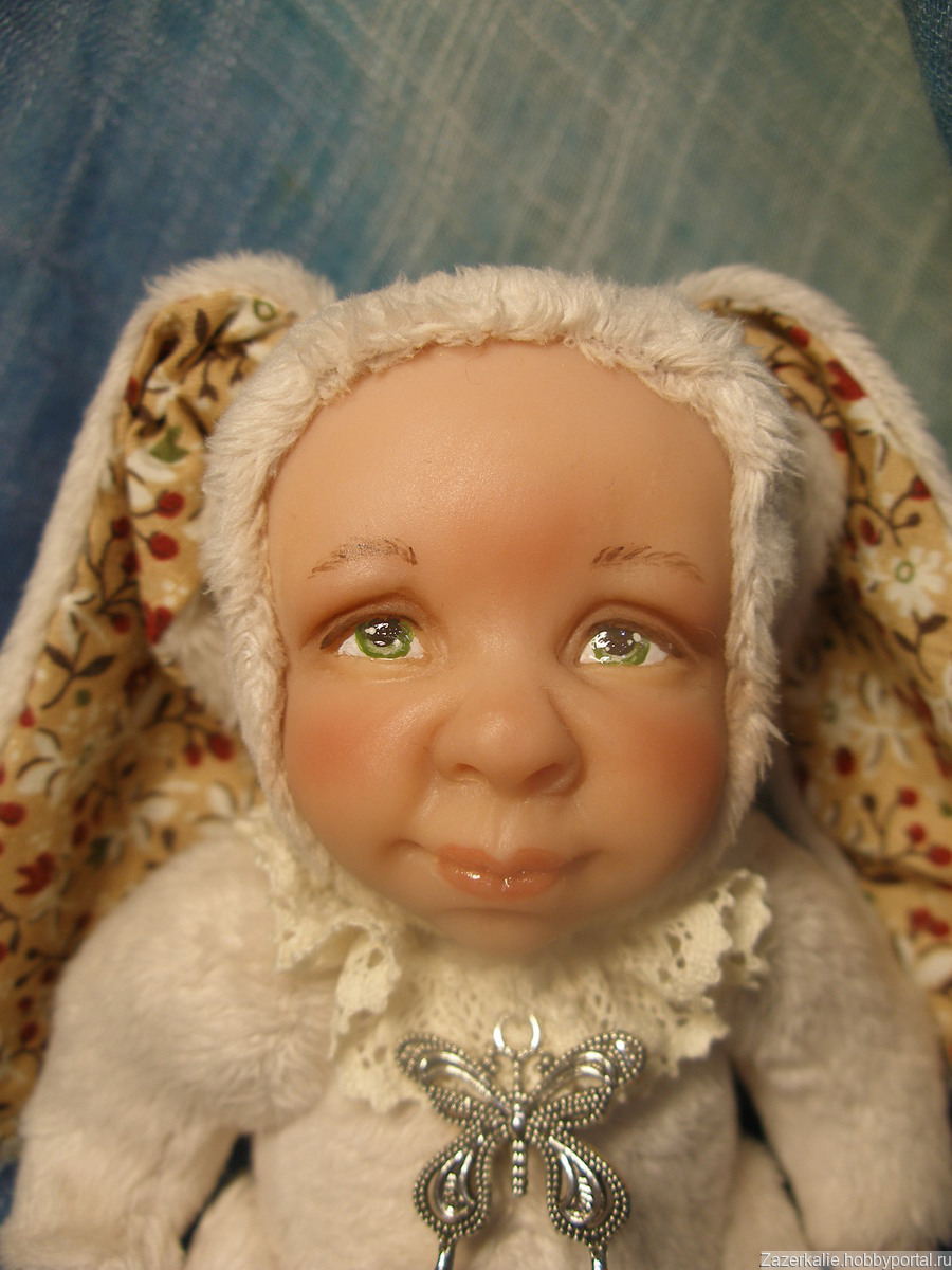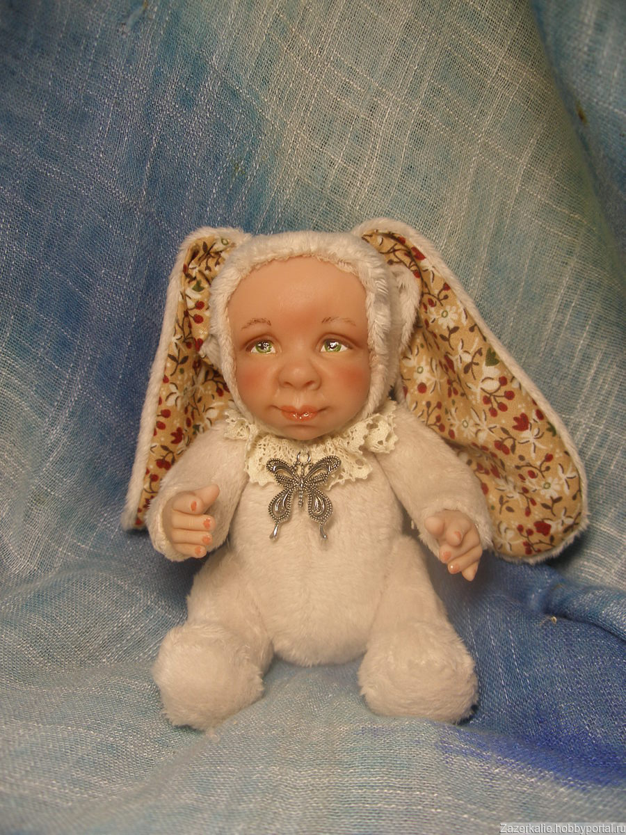 Тедди долл Зайка. Тело выполнено из искусственного меха,плотно набито синтепоном. Голова-шплинтовое соединение, лапки-нитяное, подвижен.Лицо, руки слеплены из полимерной глины Living Doll.В единственном экземпляре, повторение не возможно.Рост малышки стоя 16см.