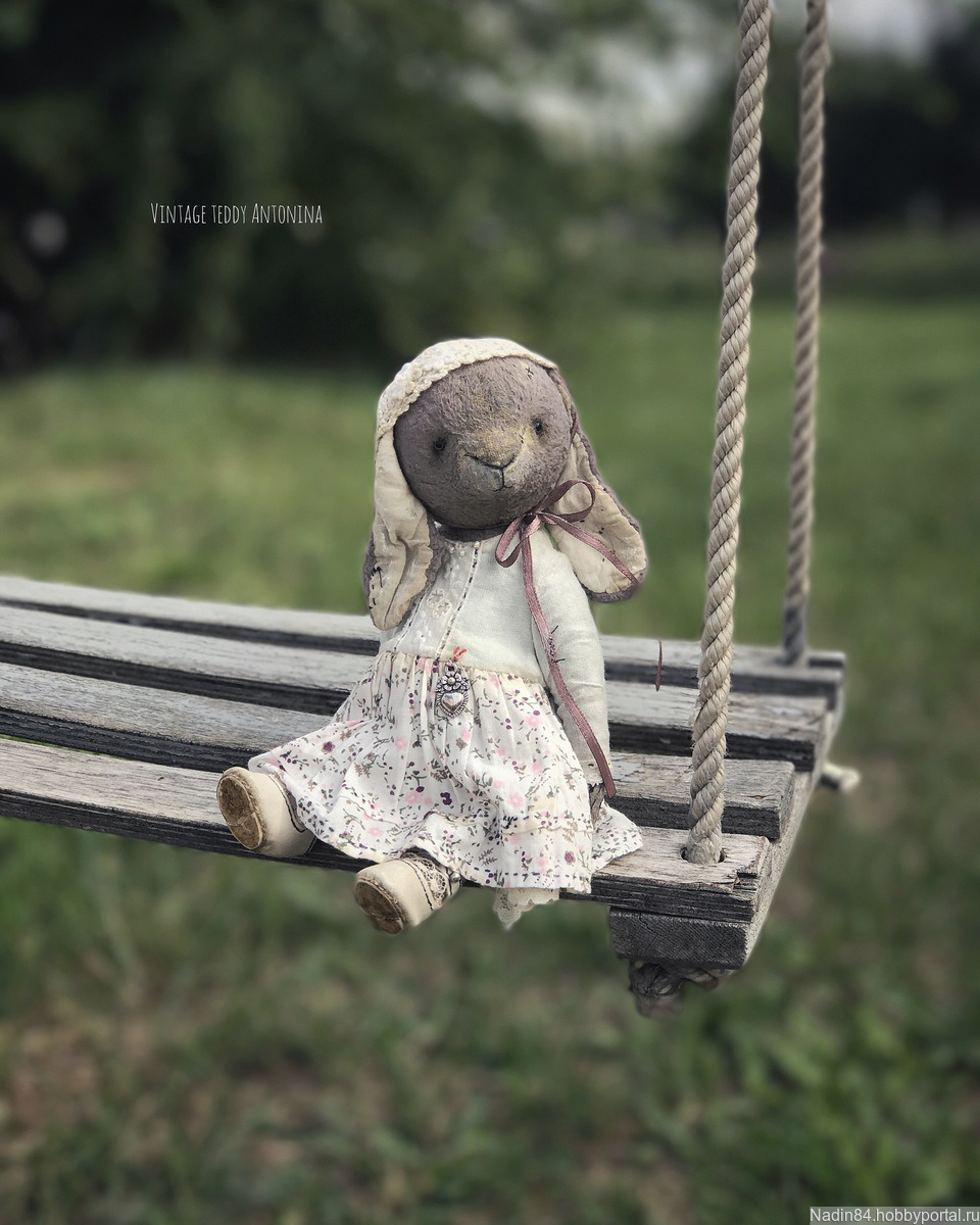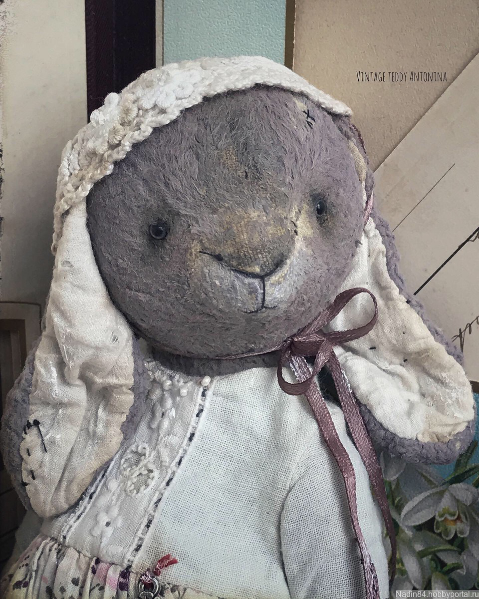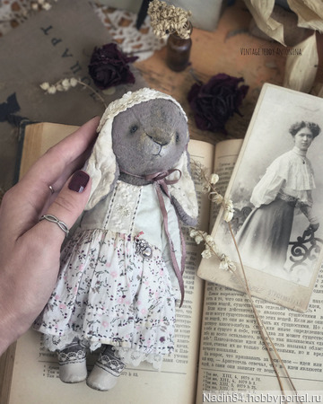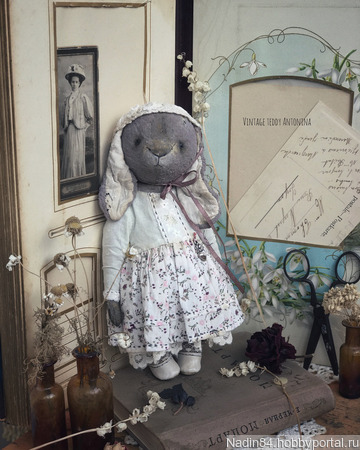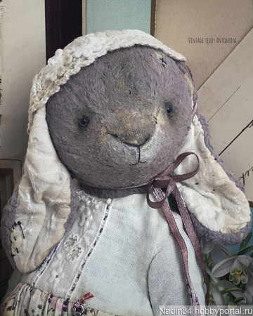 Очень летняя,романтичная и нежная зайка по имени Антонина (Тоня) Antonina готова!! ....С ноткой аромата полевых цветов и вкусного лета!! Сшита полностью вручную в технике тедди (винтаж).Умеет самостоятельно сидеть...стоять с опоройСшита из винтажного заваленного плюша ручной обработки,окрас светло -пыльно серый..набита опилочками (плотно),древесной шерстью и конечно же моей любимой лавандой..утяжелена металическим гранулятом...глазки акриловые (пр-во Беларусь)..5 шплинтов( голова, руки, ноги-подвижны).Одета в лёгкое платье из индийского хлопка и хлопка ручного окрашивания ( на подкладе).Использавано антикварное кружево,батист,металическая подвеска,пуговки,бисер.На голове шапочка связанная крючком из хлопка,атласная лента.Обута в туфли из натуральной кожи.Все съемное!!! Зайка в единственном экземпляре. Слегка затонирована и состарина..р.s прилетит к Вам в винтажном домике,с паспортом и частичкой моей души!!