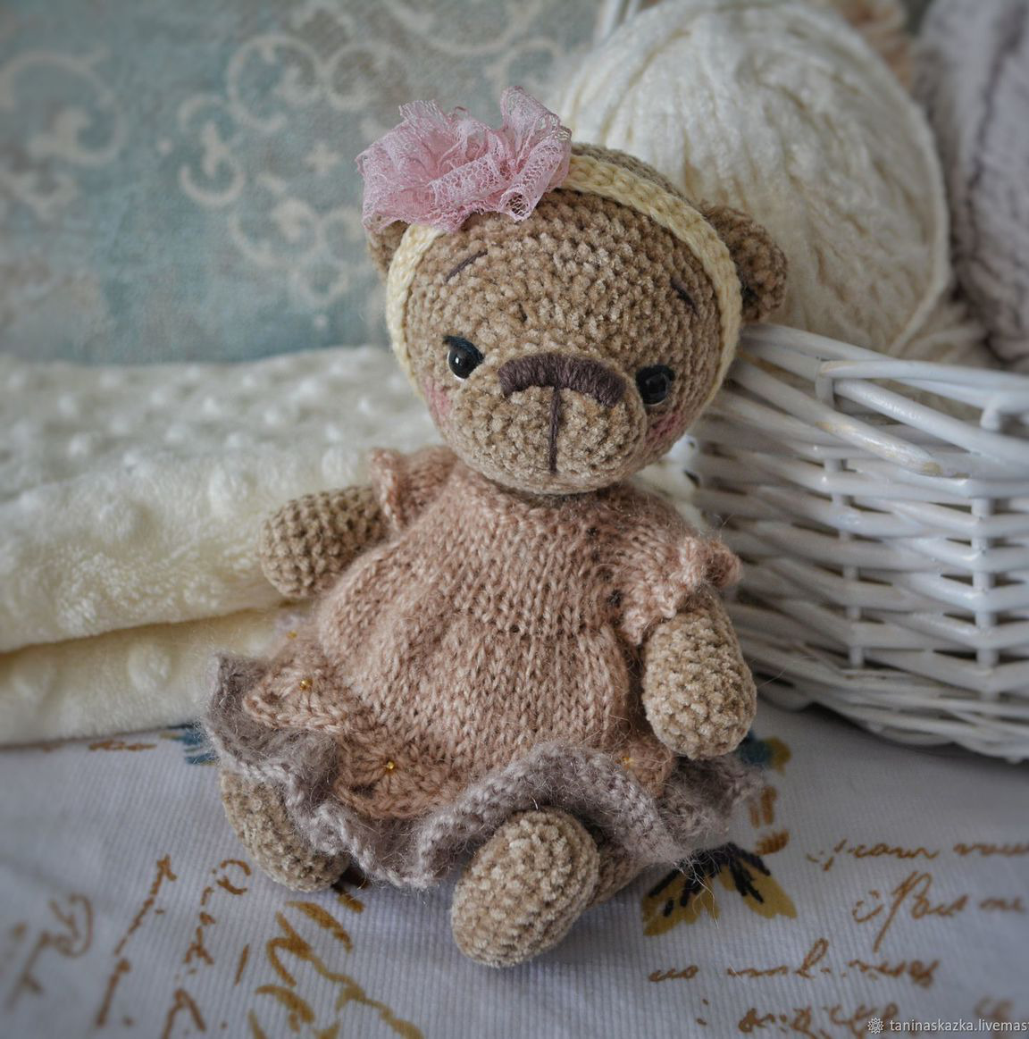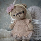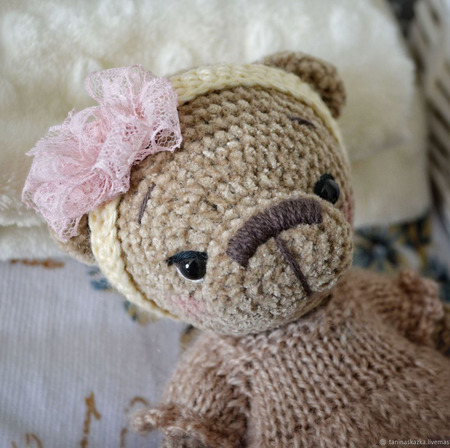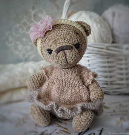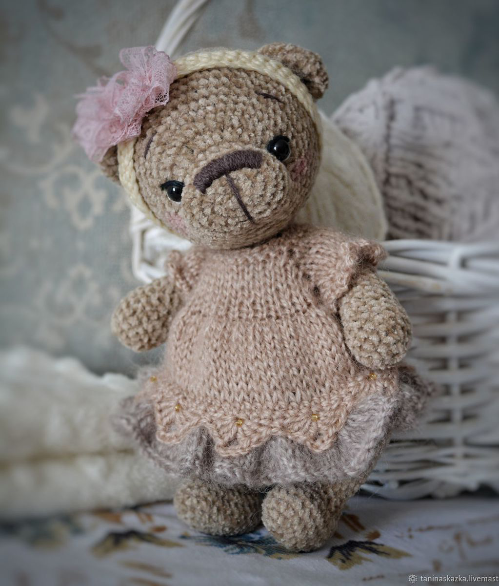Мишутка из плюшевой пряжи, рост 15 см. Платье и повязка снимается. Голова и лапы на подвижных шплинтах, внутри синтепух. Глазки пластиковые. Сидит уверенно, стоит с поддержкой.