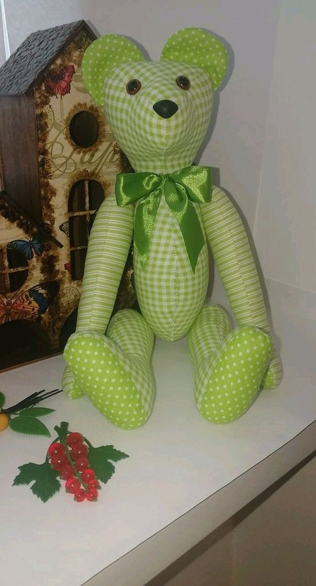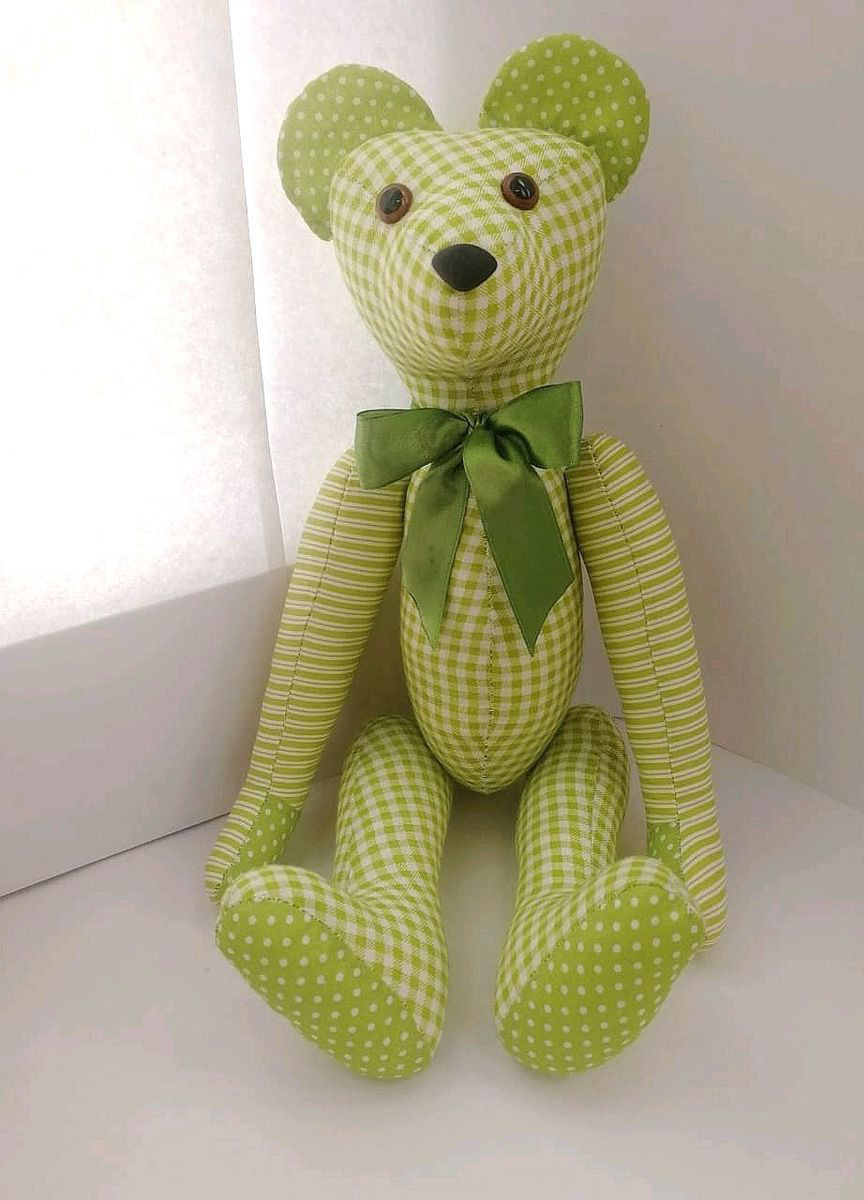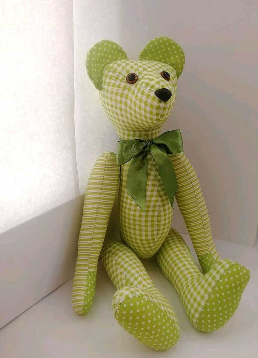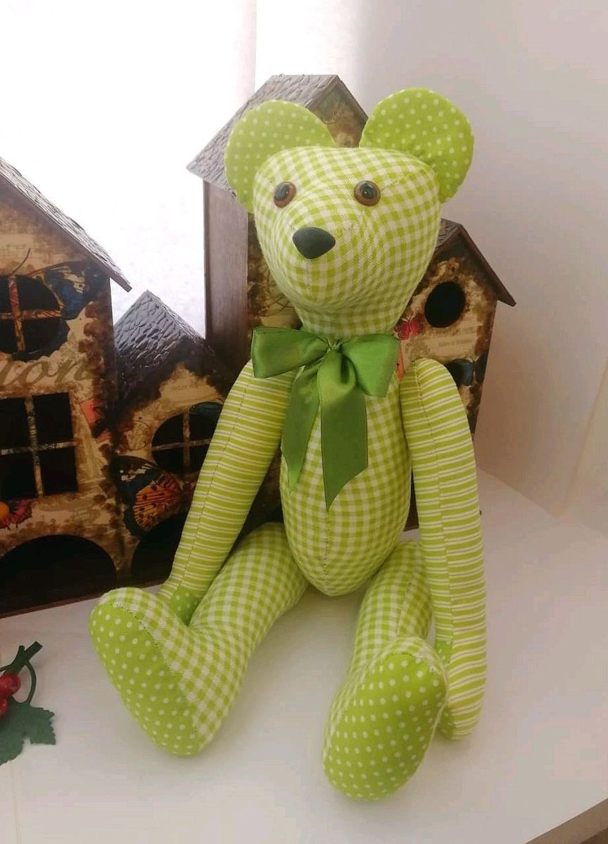 Хотите весны? Тогда этот Весенний Миша для Вас. Хлопок нежно-зеленого цвета, горошки, клеточки и полосочки - это настоящая весна в самом разнообразном ее воплощении. Миша станет замечательным подарком, ведь в таком цветовом исполнении он единственный и повторить один в один его невозможно. Миша сшит вручную, ни единого машинного шва. Лапки вращаются, вставлен безопасный механизм. Глазки и носик также на безопасном креплении. Добавьте в свой домашний уют капельку весны!