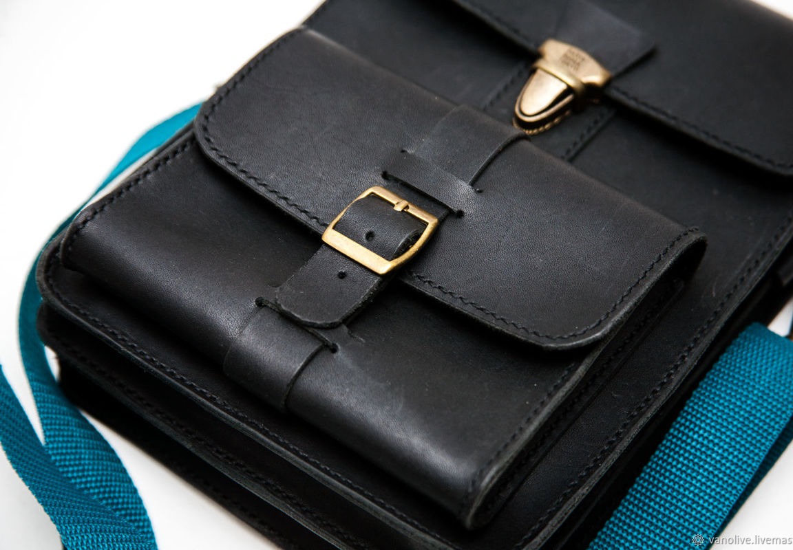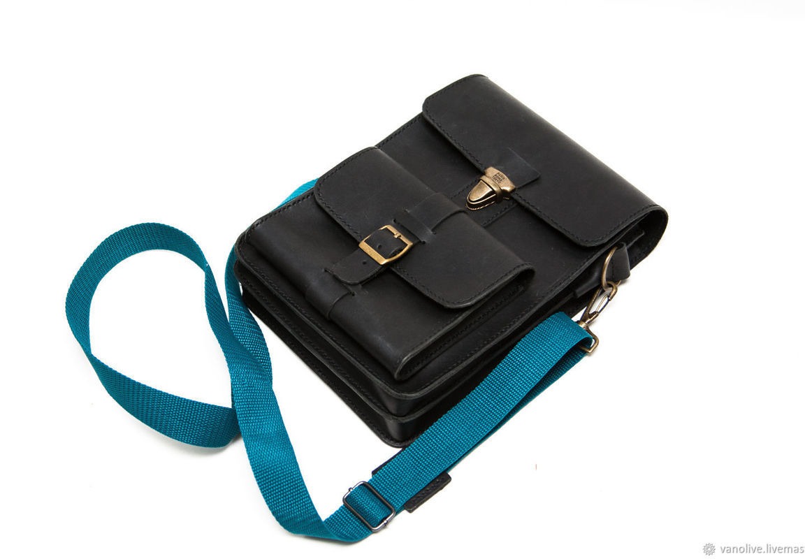 Сумка из натуральной кожи. Цвет черный, ремень изготовлен из бирюзовой стропы.