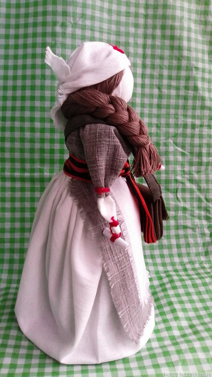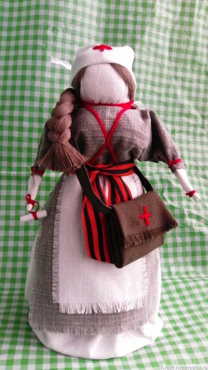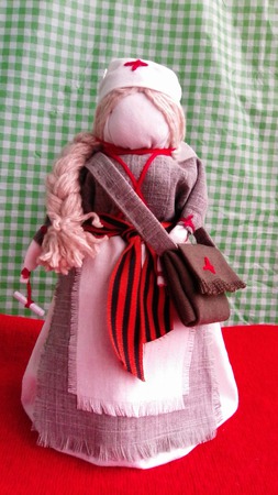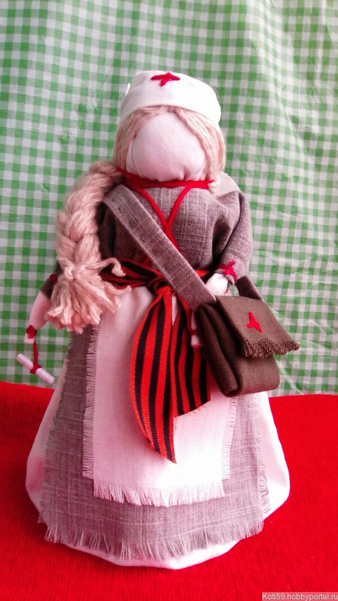 Когда началась война, девочке Тане было 9 лет.Ее отец ушел защищать Родину.Таня очень хотела,чтобы война поскорее закончилась,и чтобы ее отец живым вернулся домой.Переживая за отца,она сделала куклу,которую назвала Фронтовая сестра.Кукла-медсестра,через плечо у нее была санитарная сумка,голову покрывала косынка с красным крестом,а к рукам привязаны маленькие записочки.Как оказалось,всю войну девочка писала записки своему отцу и привязывала их к кукле.В этих записках Таня просила куклу быть рядом с отцом и помогать ему.