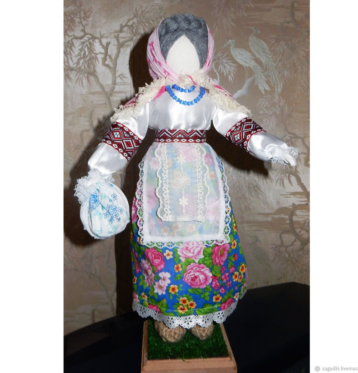 В руке куклы - узелок с "хозяйством" - Внутри - зерно ( сытая жизнь), монетка (для прибыли), шерсть (для защиты от зла), лавр ( для поглощения негатива.) , мак ( для памяти рода).