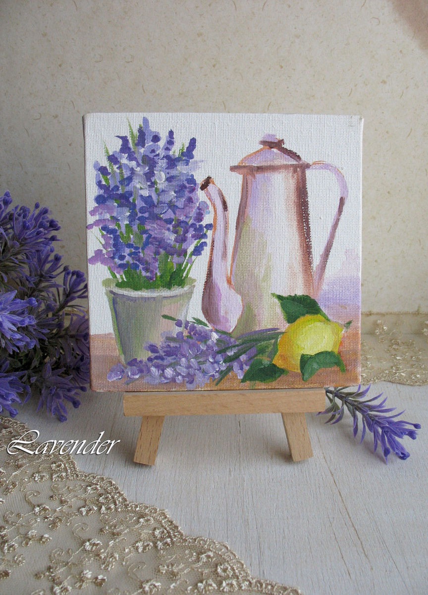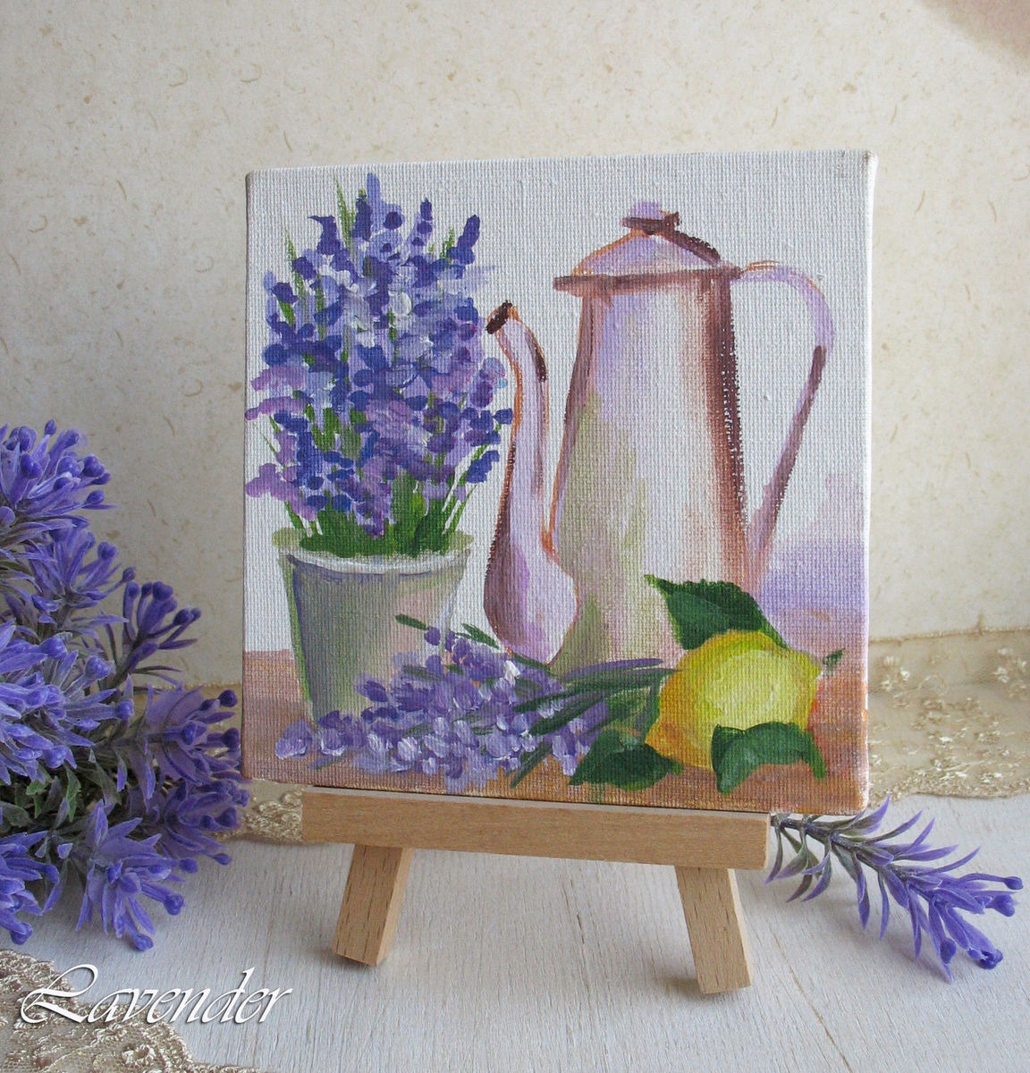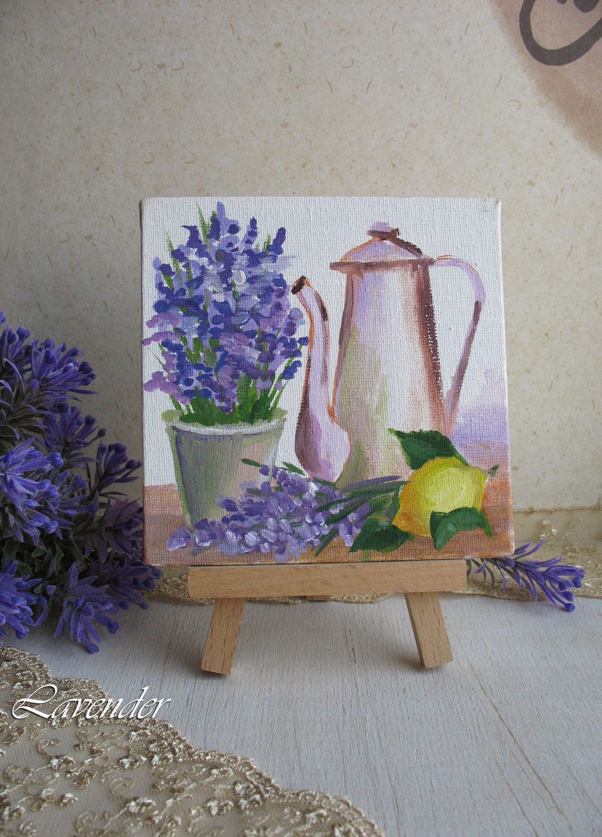 Картина натюрморт - маленький букет лаванды. Картина нарисована акрилом на высококачественном грунтованном холсте для живописи. Минимализм в деталях - букет лаванды, чайник и лимон.