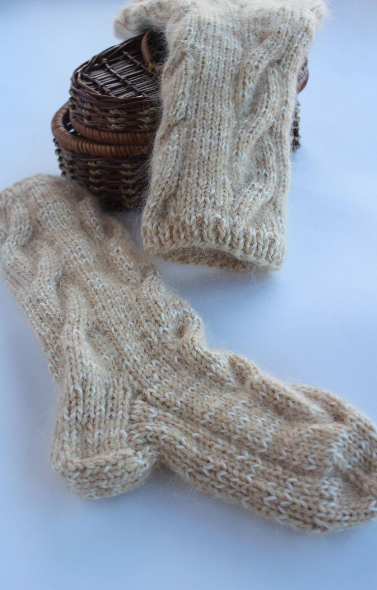 Носки связаны на спицах из шерстяной пряжи в состав которой входит мохер, отчего они становятся немного обьемней и еще теплей.