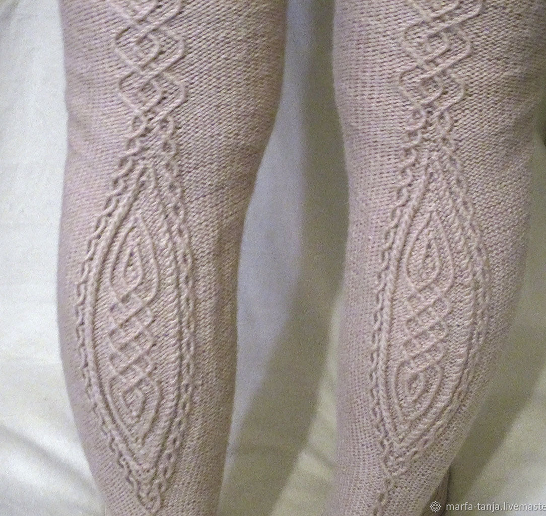 Чудесные гольфы связаны на спицах из немецкой полушерстяной пряжи (очень теплые). Доходят до середины бедра. Подходят для ножек средней полноты. Вертикальный узор визуально удлиняет ноги.
