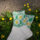 Носки из собачьей шерсти ручного прядения. Пряжа из вычеса собаки породы пиренейская горная. Жаккардовый рисунок вывязан фабричной цветной пряжей. Пятка двойная, при вязании стопы и пятки добавлена доп. нить для прочности.