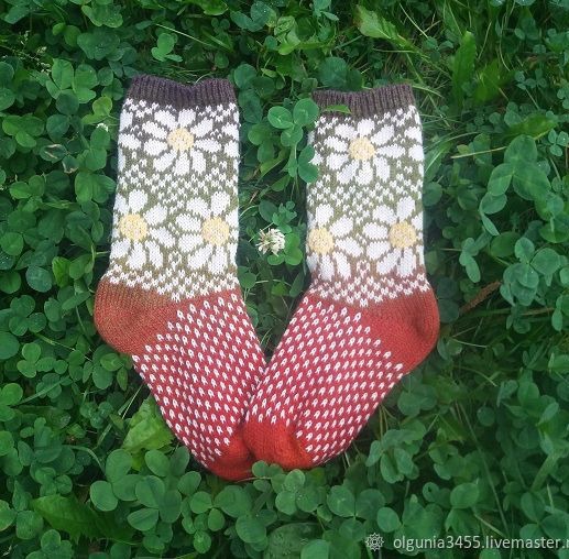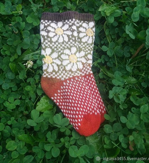 Носки с орнаментом ромашки связаны на машине из 100 % шерсти . Красивые, теплые и комфортные, согреют ваши ножки. Пяточка и мысок двойные за счет переплетения - авторская разработка + добавлена ниточка ПЭ для прочности. аккуратный шов не причиняет неудобство.