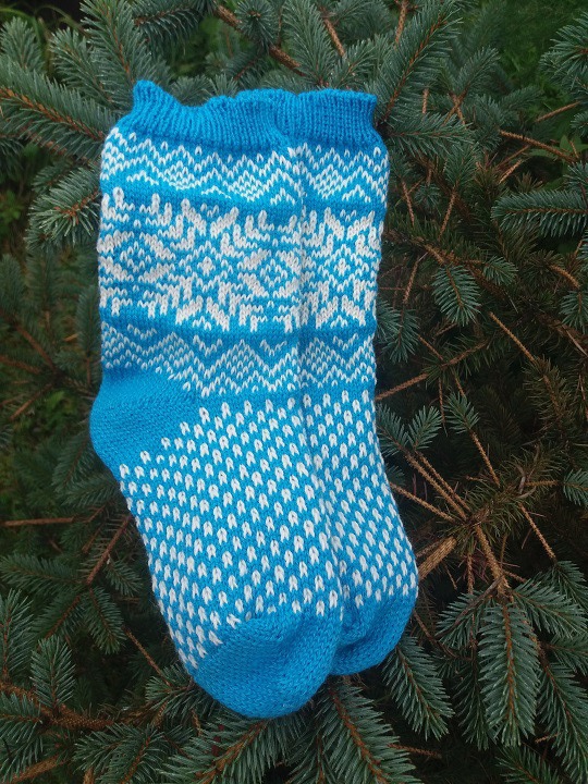 Носки с орнаментом снежинка связаны на машине из 100 % шерсти . Красивые, теплые и комфортные, согреют ваши ножки. Пяточка и мысок двойные за счет переплетения - авторская разработка + добавлена ниточка ПЭ для прочности. аккуратный шов не причиняет неудобство.