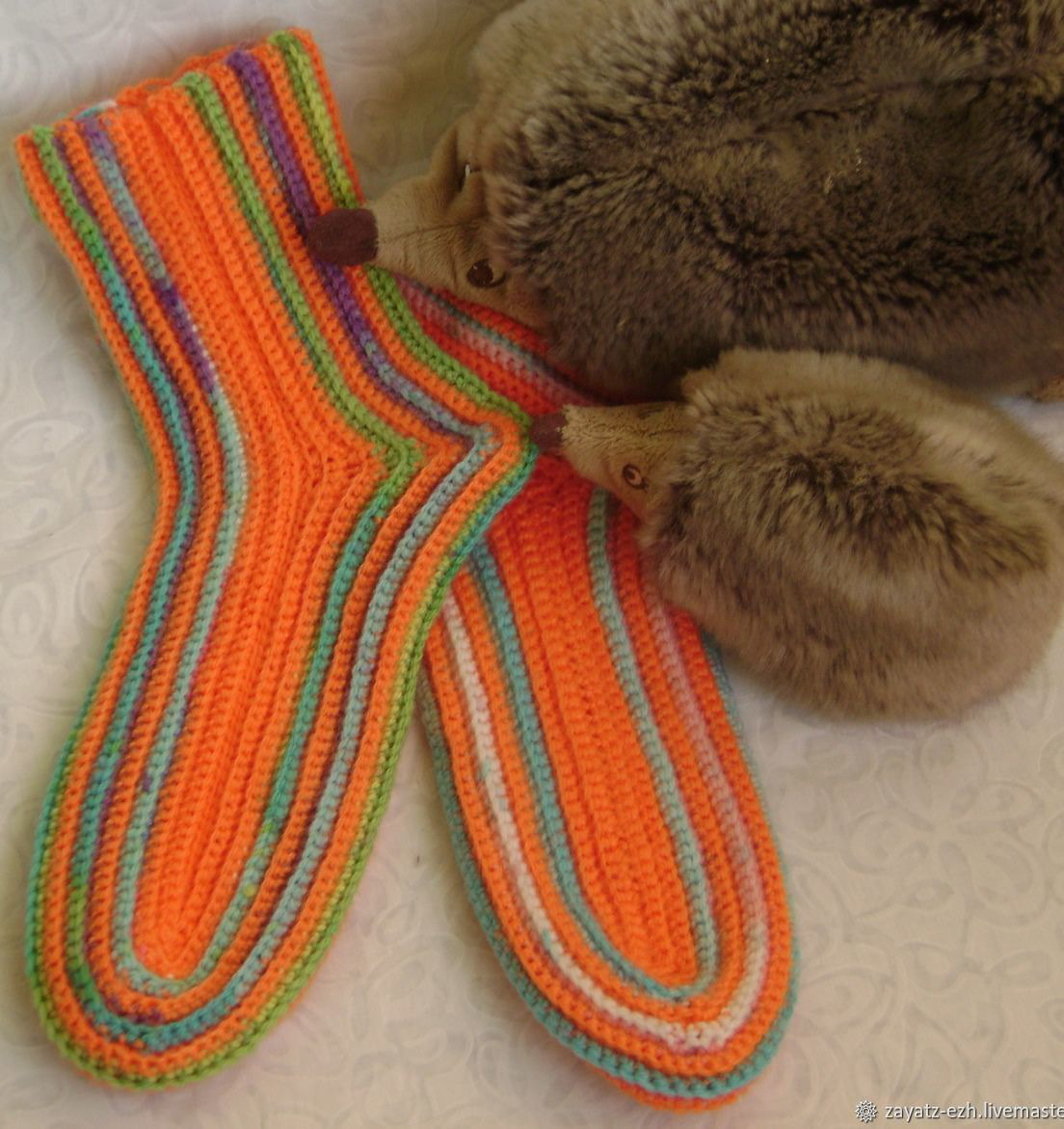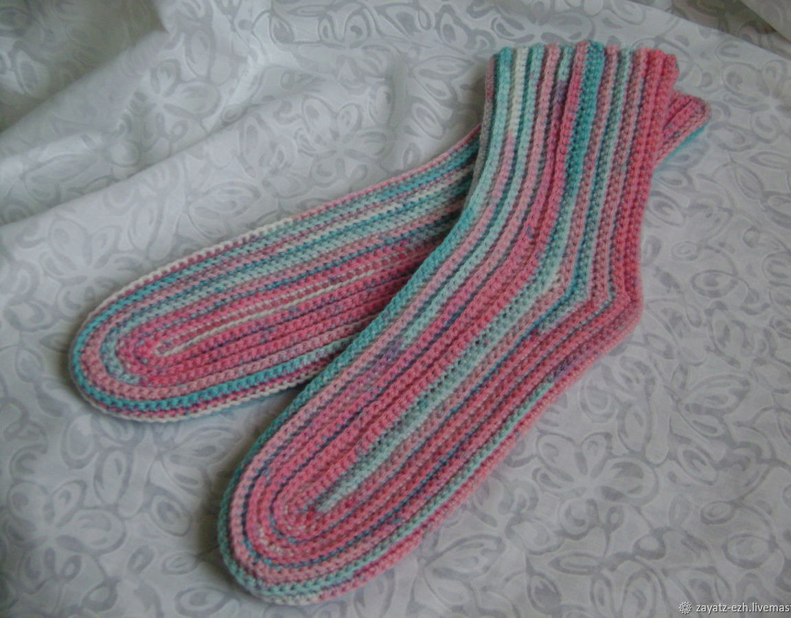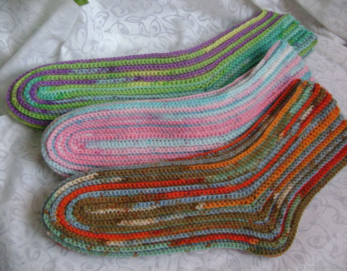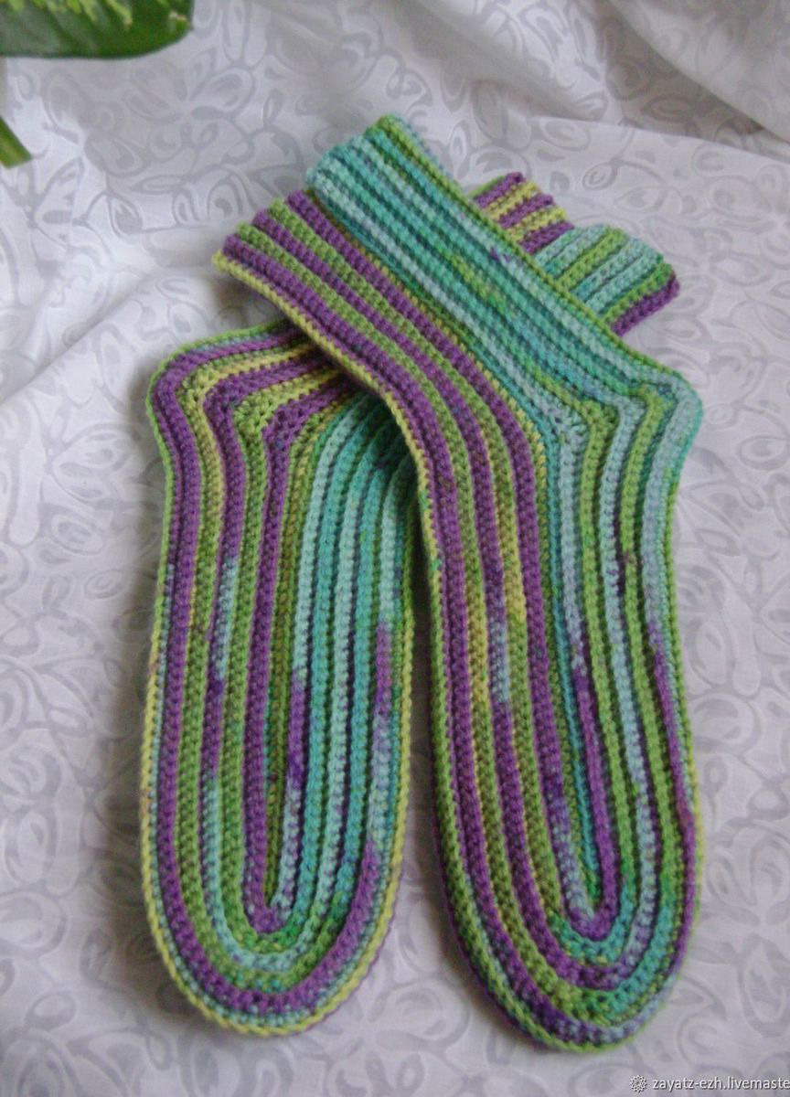 Теплые носки, связанные крючком из пряжи секционного крашения.