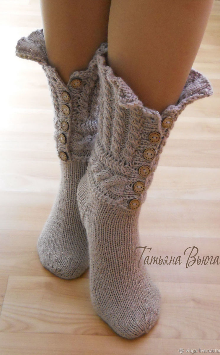 Эти мягкие, теплые носочки в деревенском стиле связаны из полушерстяной пряжи. Пуговицы из кокосовой стружки. Расстегиваются. Верхнюю часть носка можно связать без расширения, плотно прилегающую к ноге. Это по вашему желанию.