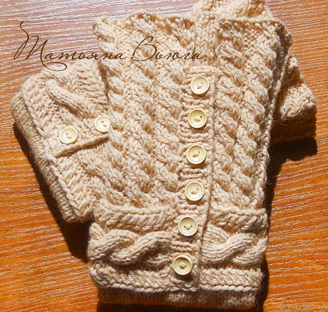 Не знаю почему у меня именно такие ассоциации с этой работой. Может потому, что связаны из пряжи цвета близкого к некрашеному льну? А может из-за пуговиц очень похожих на деревянные, которые носили в старину. Или из-за поперечной косы, напоминающей браслет.. Но что-то в этом определенно есть.)