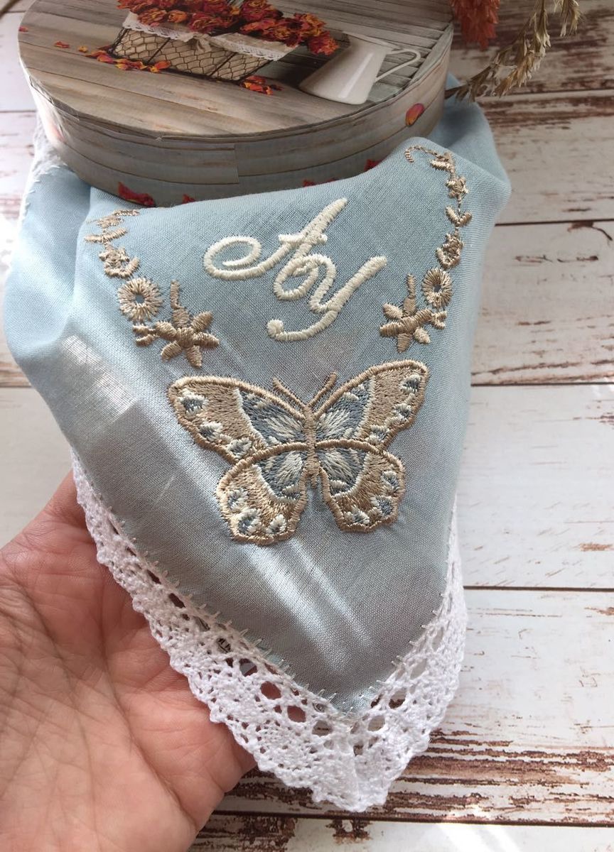 Очень нежный , голубой платочек с уникальной вышивкой Бабочки и инициалов (будут вышиты ВАШИ инициалы) станет украшением Вашей косметички или отличным подарком любимым и близким!