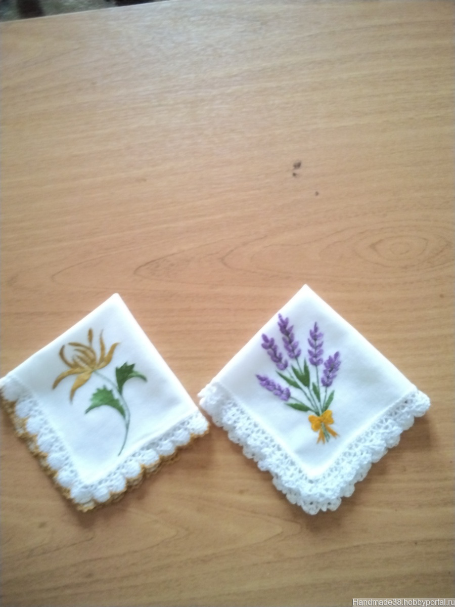 Платочки носовые,полностью ручная работа:вышивка гладью,кружево ручной работы.Цена указана за 1 платок(450 руб).Работа готова к продаже.Доставка:самовывоз из Люберец или отправка почтой после предоплаты(цена+почт.расходы).