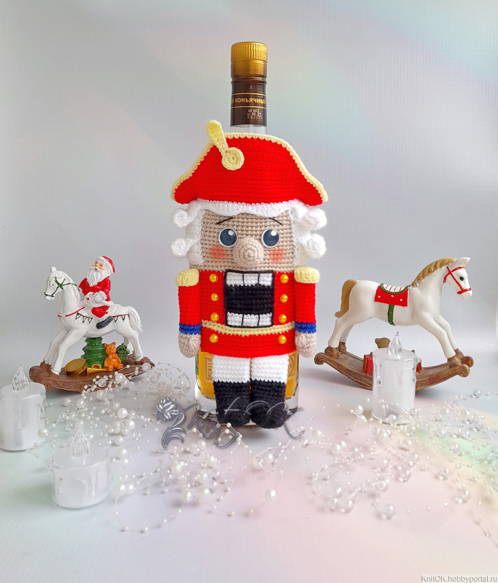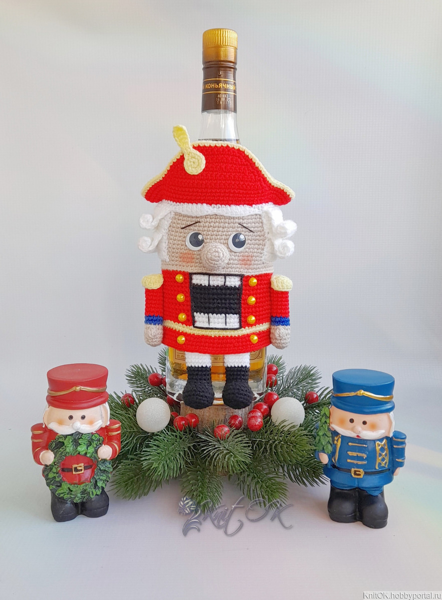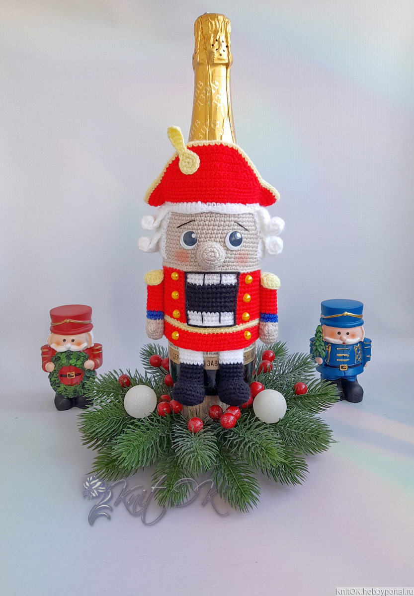 чехол на бутылку, чехол на шампанское, щелкунчик, оформление бутылки, украшение на бутылку, украшение на шампанское, вязаный чехол на шампанское, вязаный чехол на бутылку, декор бутылки, вязаный щелкунчик
