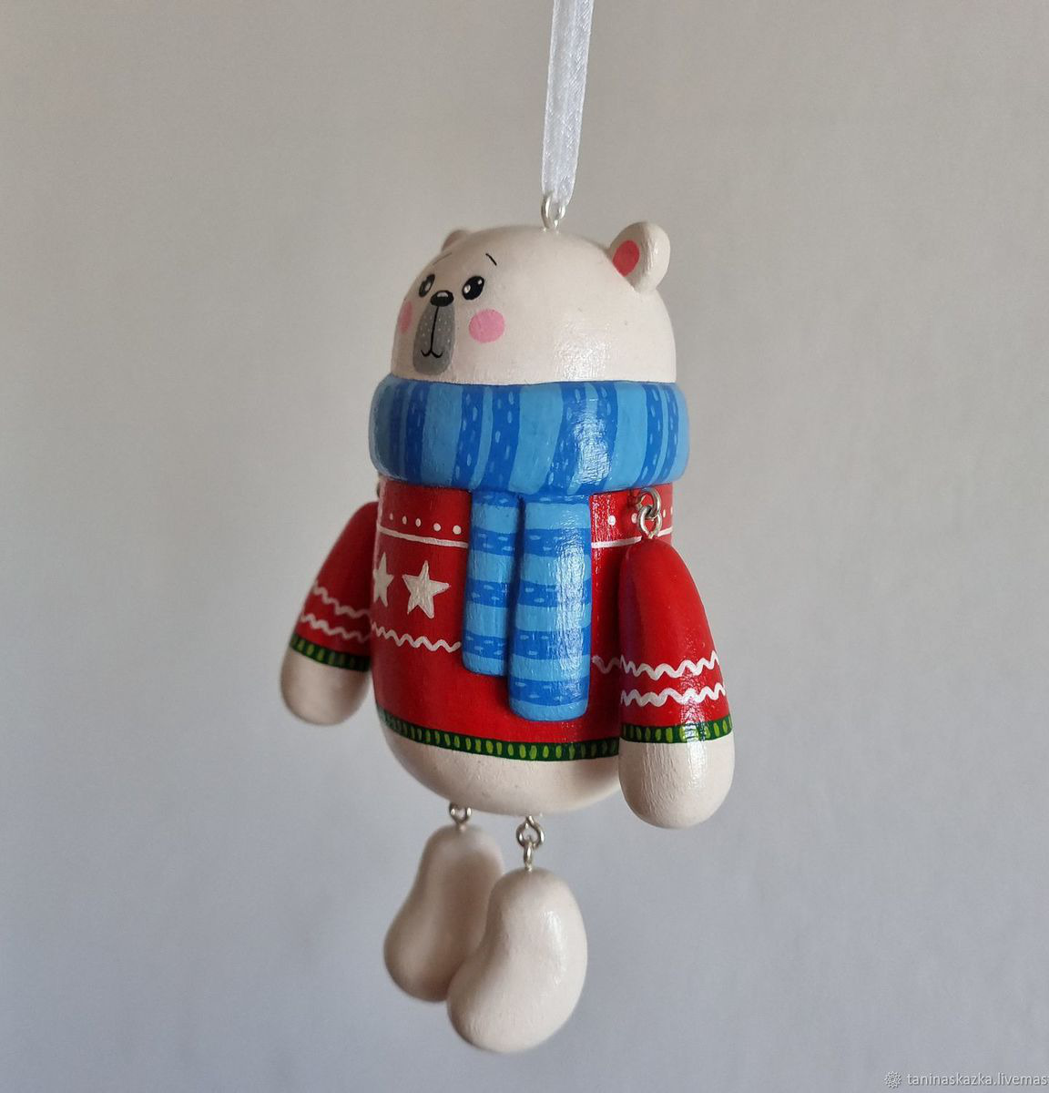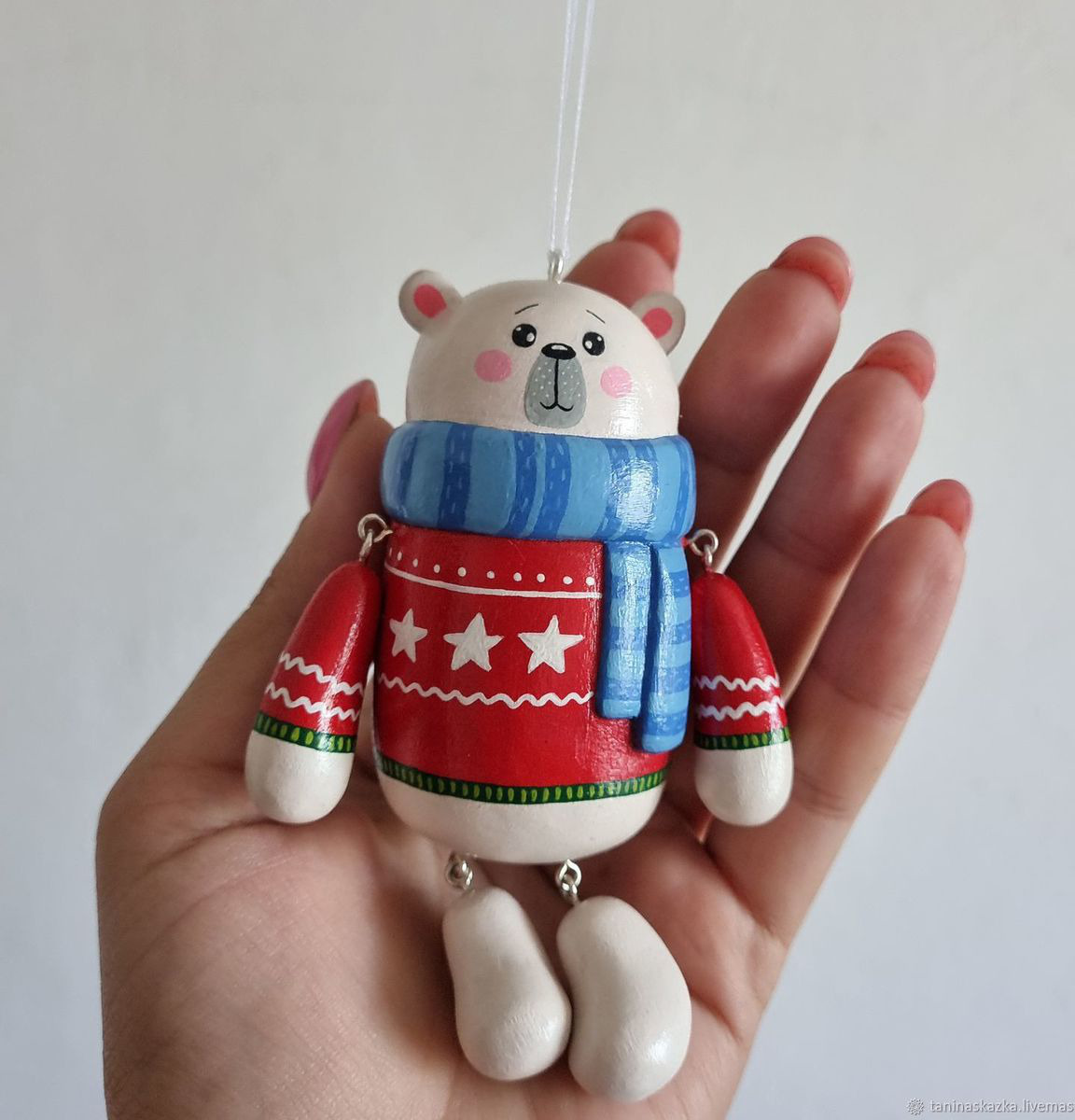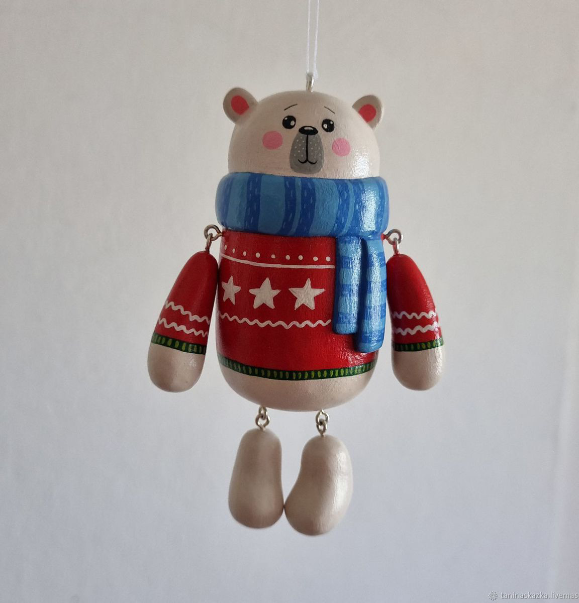 Деревянный косолапик вырезан из липы, весело звенит подвижными ручками и ножками. Мишка станет особенным украшением для вашей ёлочки и памятным сувениром для семьи, который будет храниться долгие годы. Для прочности и долговечности акриловые краски покрыты в несколько слоев лаком.