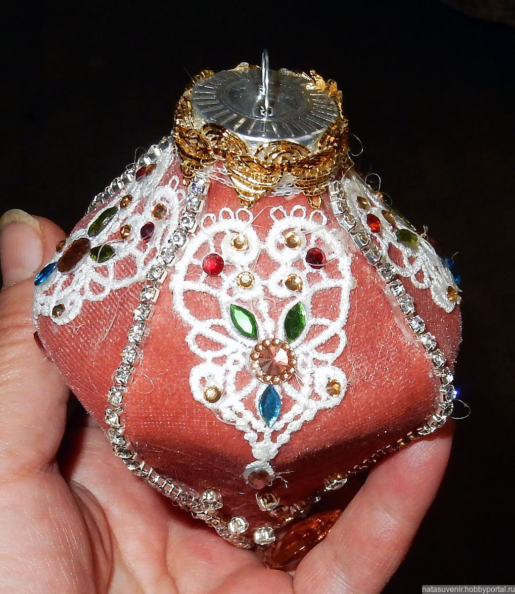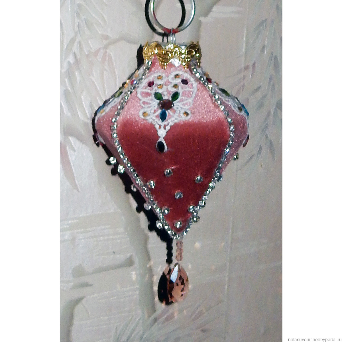 Игрушка выполнена на пластиковой основе, с использованием бархата, кружева, стразов, тесьмы.