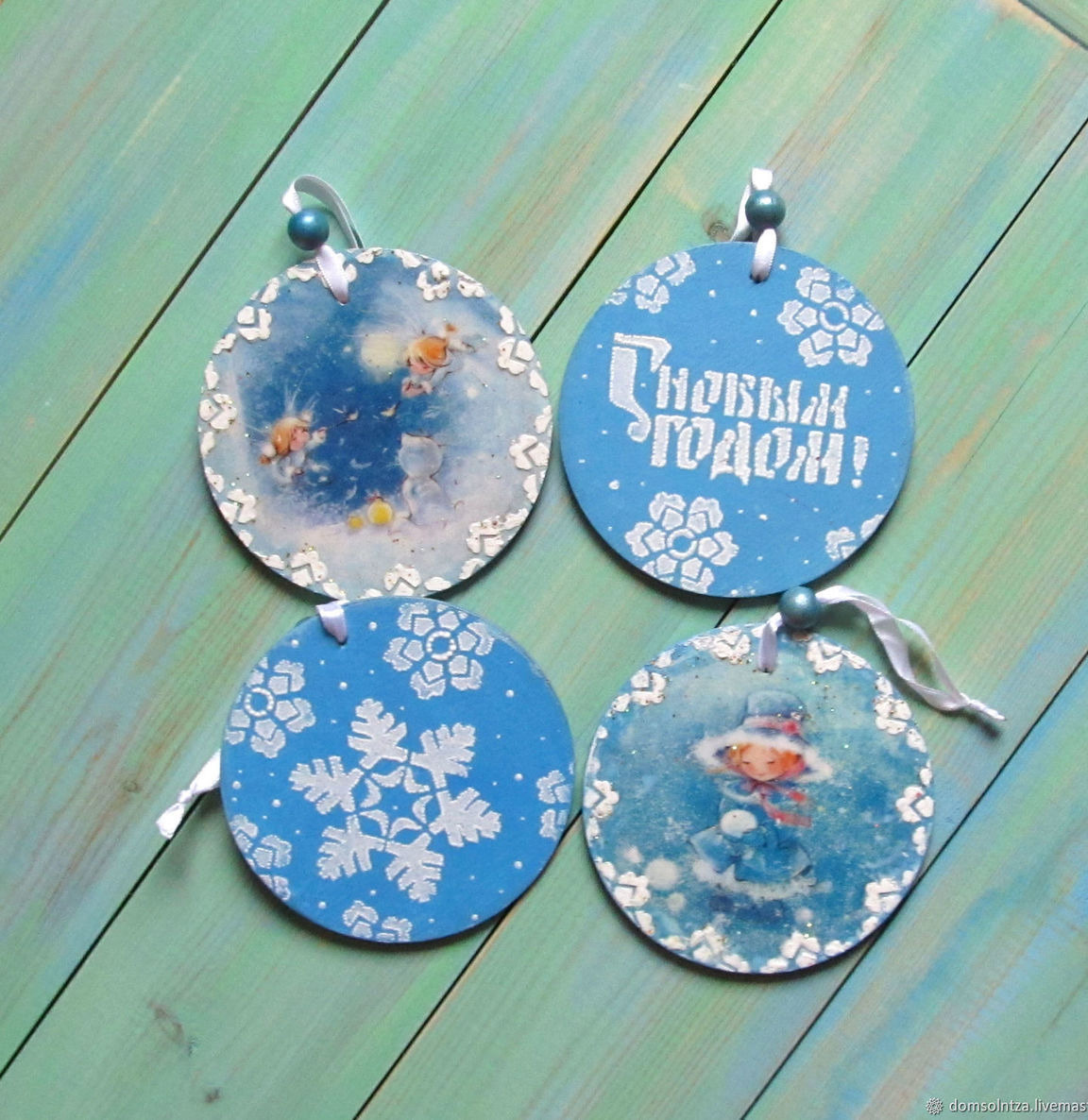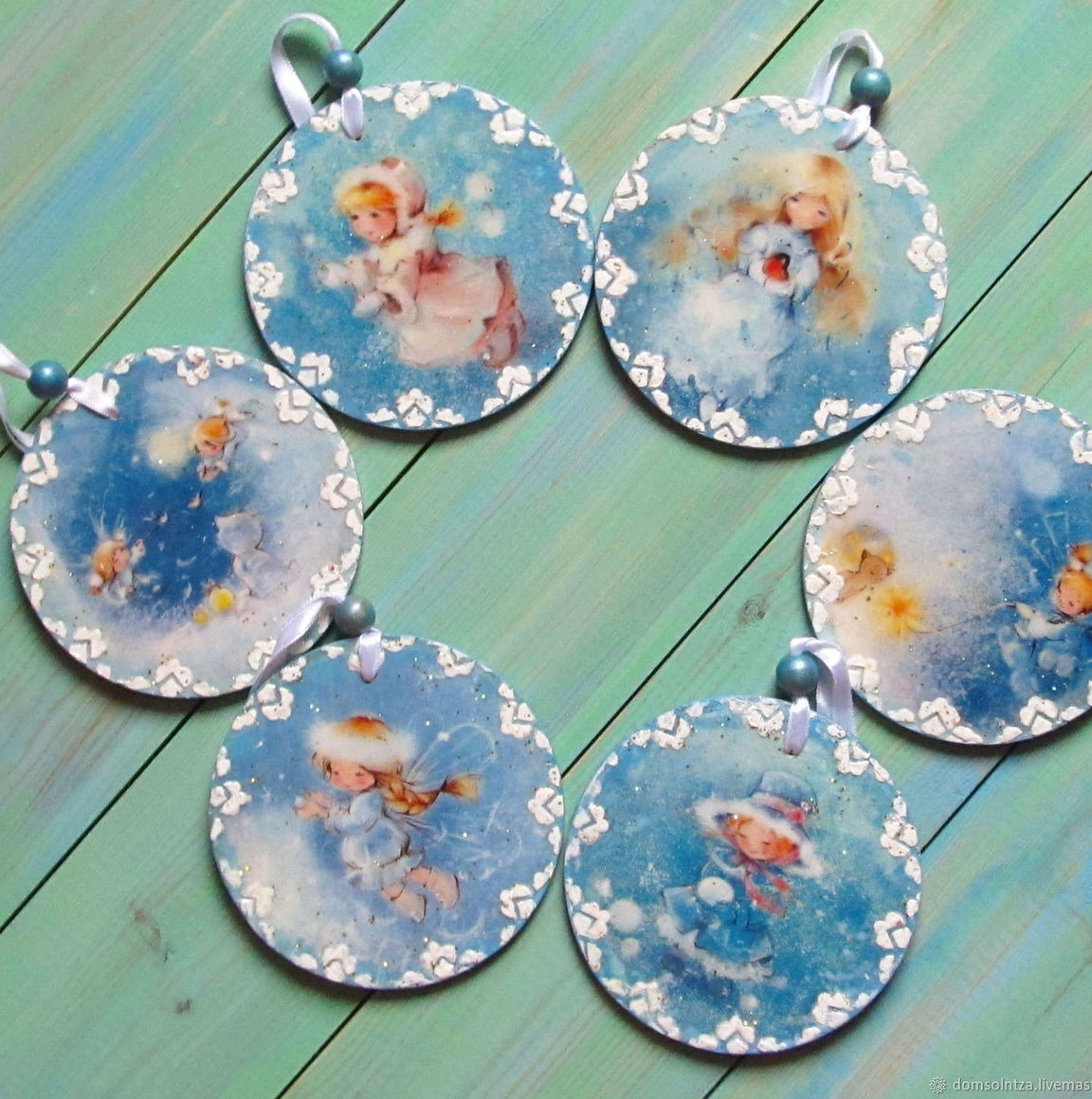 Шесть круглых елочных украшений с нежными девочками с иллюстраций Екатерины Бабок.