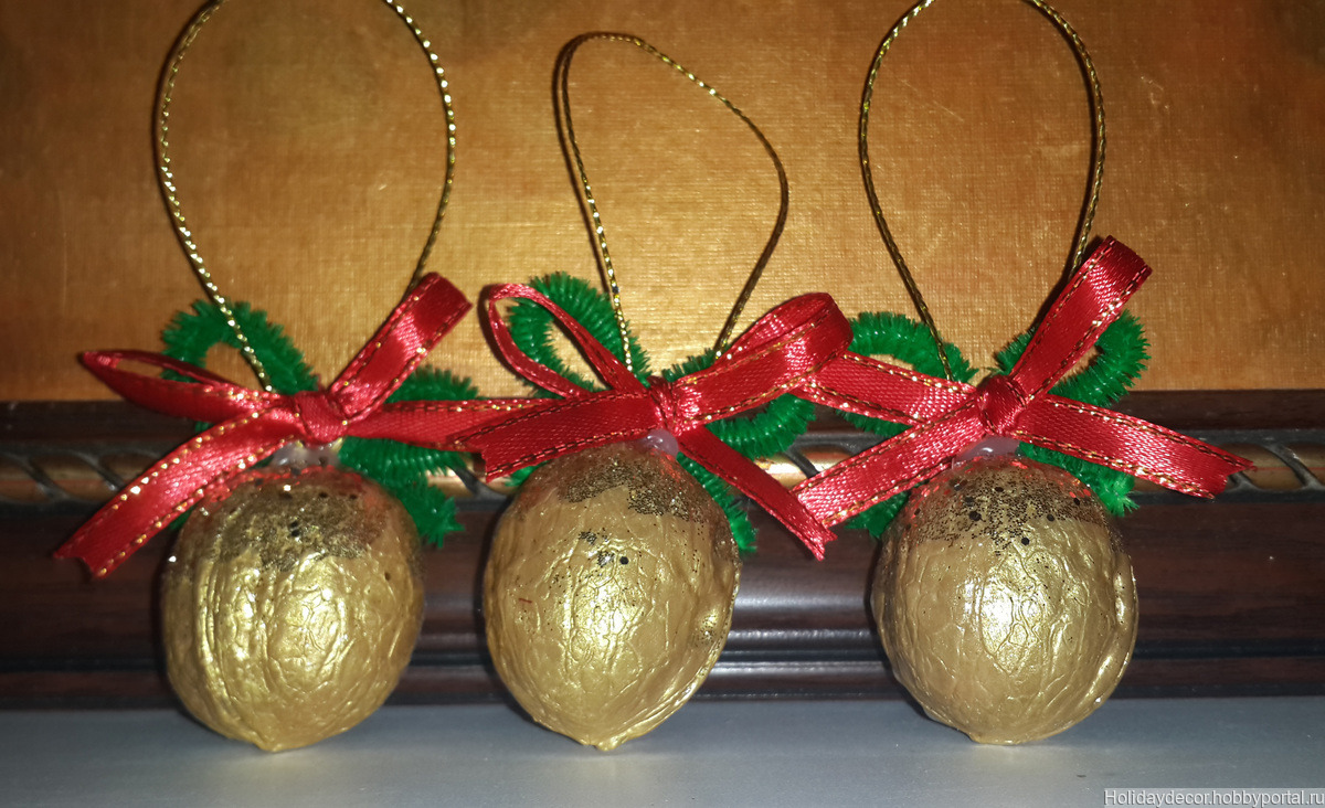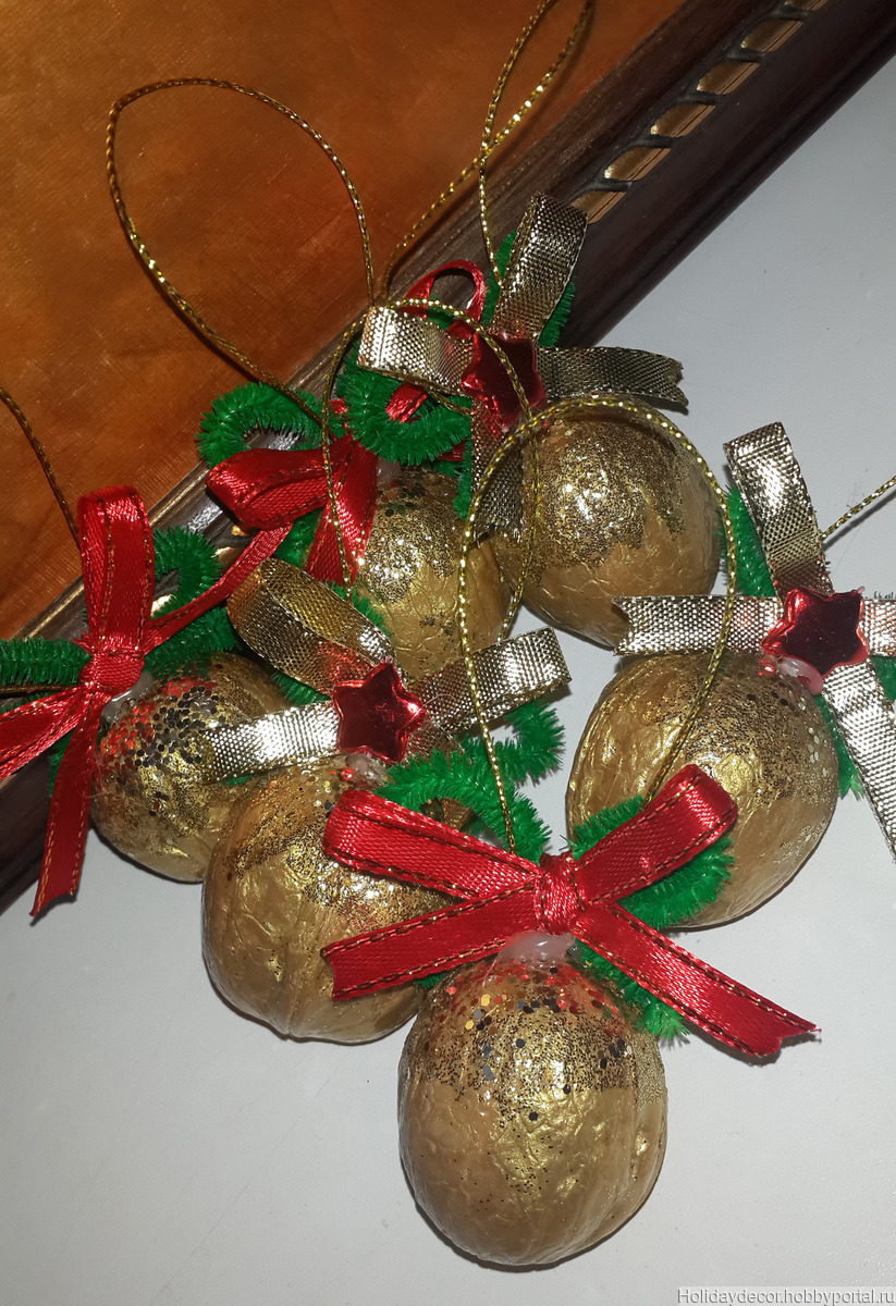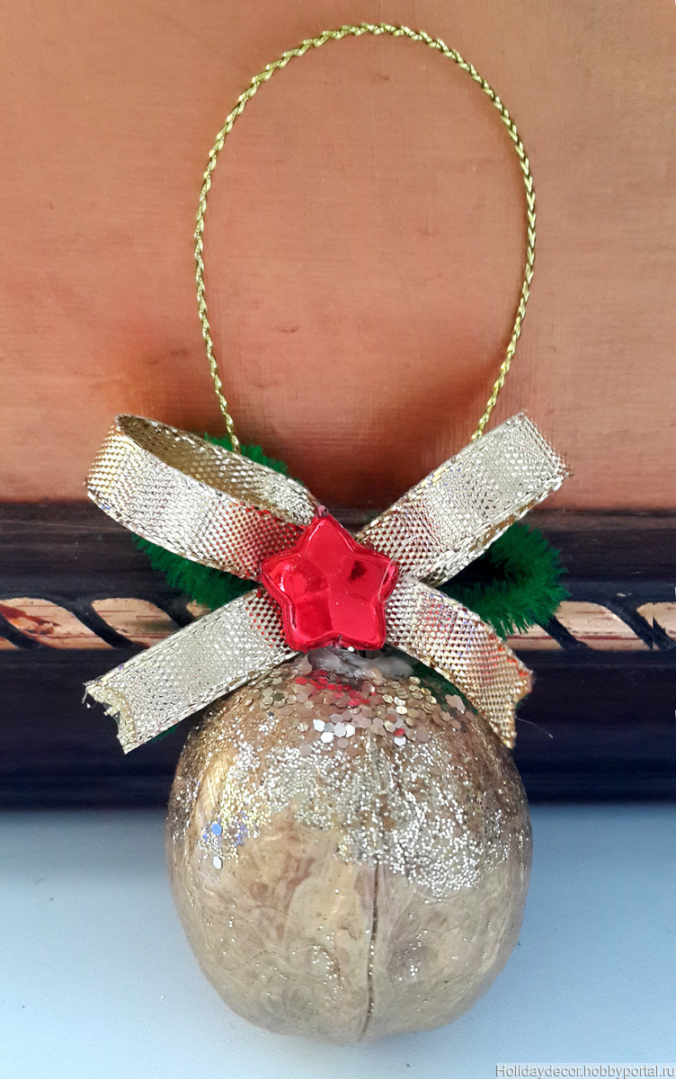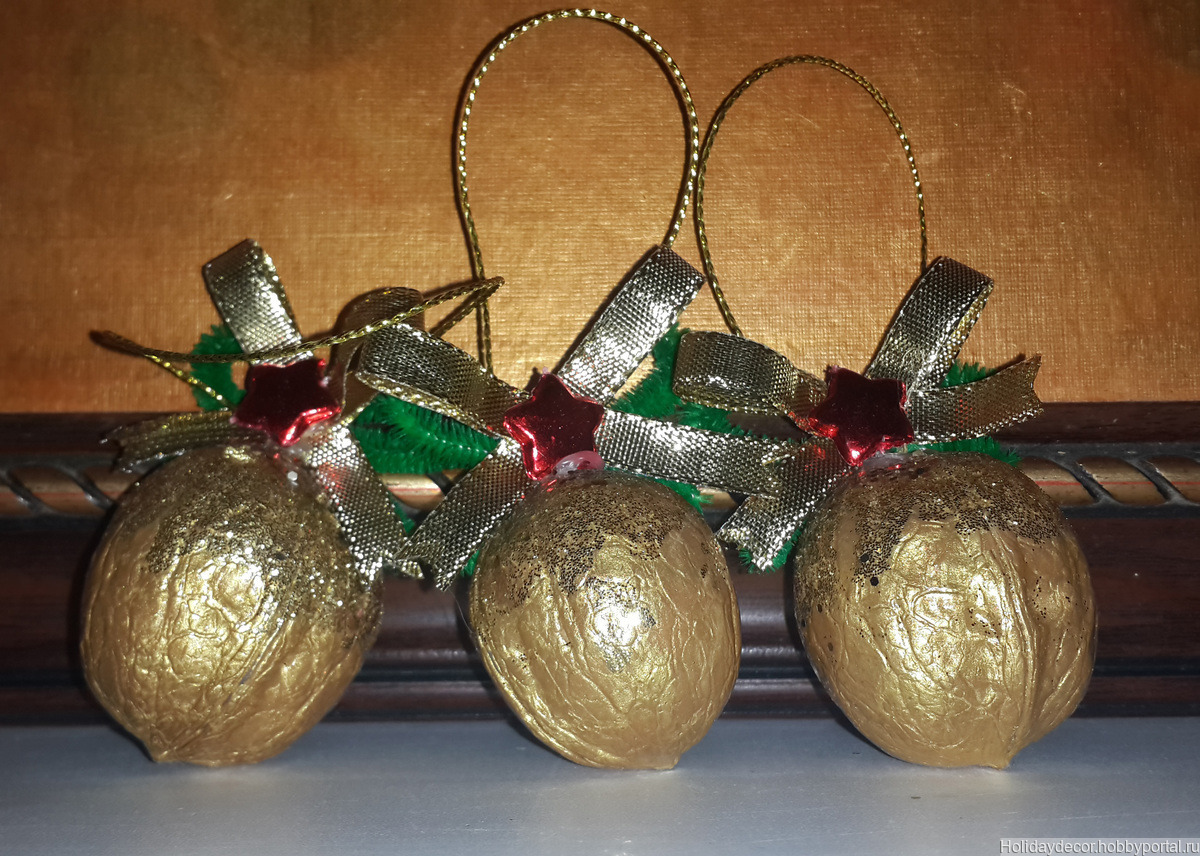 Елочные игрушки из скорлупы грецких орехов, покрытые золотой краской, акриловым лаком, украшенные парчовыми и атласными лентами, золотыми блестками, синельной проволокой. Цена указана за 1 игрушку
