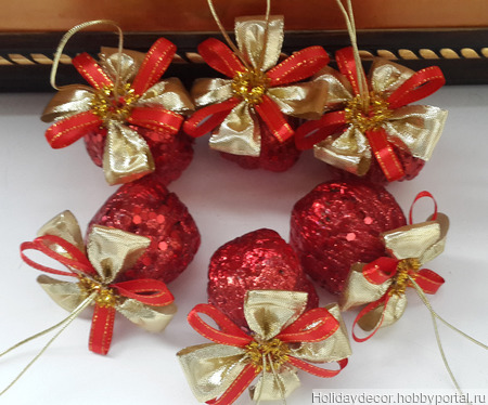 Елочные игрушки из скорлупы грецких орехов, покрытые акриловой краской и поталью в тон, акриловым лаком, украшенные парчовыми и атласными лентами, золотыми блестками, синельной проволокой. Цена указана за 1 игрушку