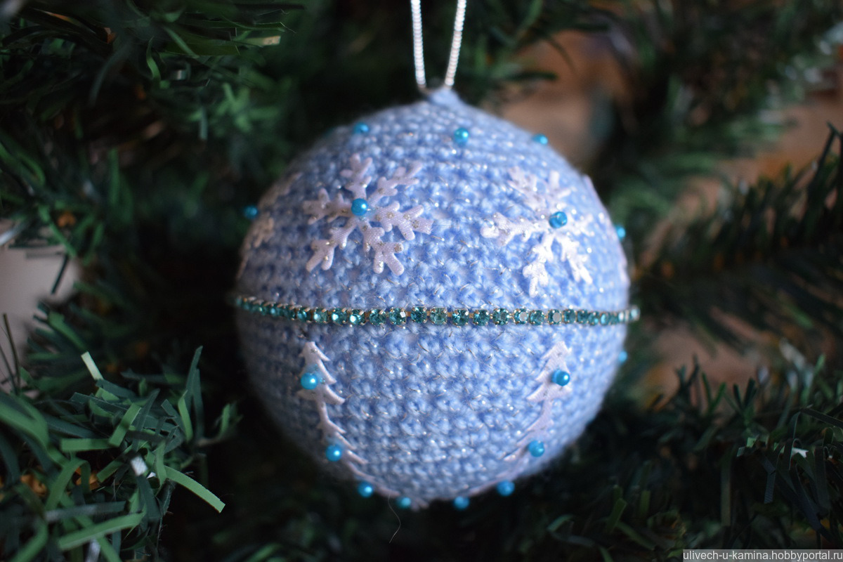 Пенопластовый шар среднего размера, обвязанный нитками голубого цвета с серебристым блеском, украшенный крупными белыми тканевыми снежинками и елочками с серебряной пылью, синими бусинами и цепочкой с темно-голубыми стразами