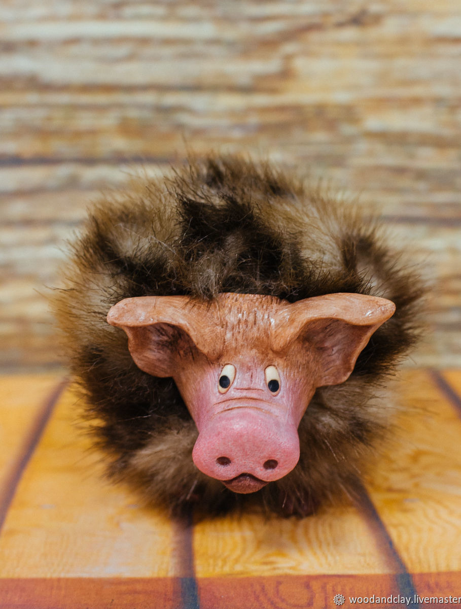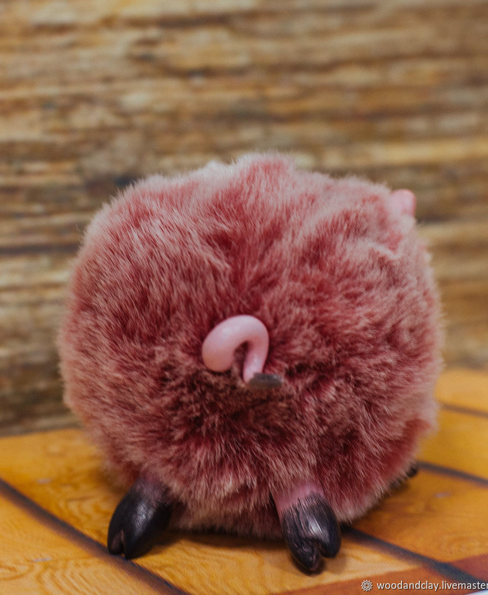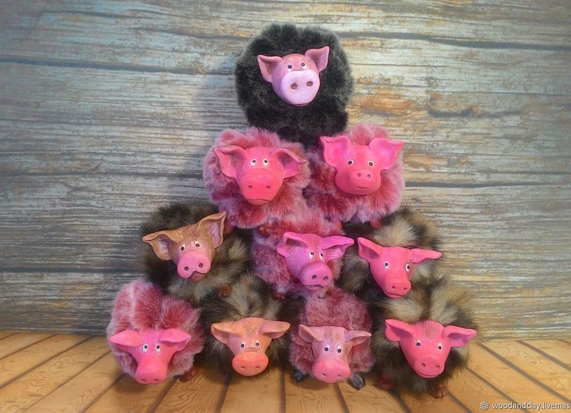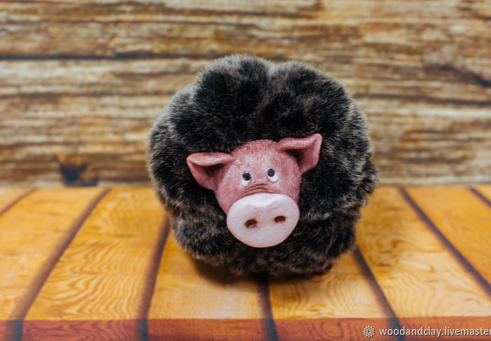 Ёлочная игрушка Хрюшка. В комплекте с ленточкой для крепления на ёлку. Морда, лапы и хвост из полимерной глины, тело из меха, наполнитель холлофайбер.