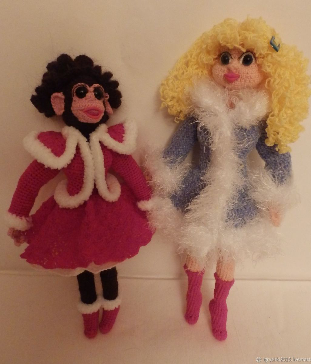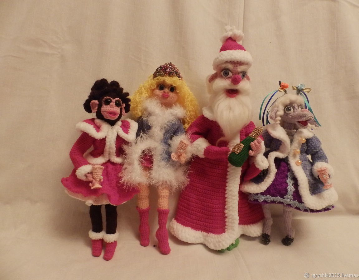 Игрушки крючком. Дед мороз, снегурочка, коза, обезьянка. Композиция из 4 персонажей + пеньки. Снимаются только шубки. Игрушки на проволочном каркасе. Можно использовать в постановочном спектакле.