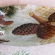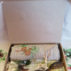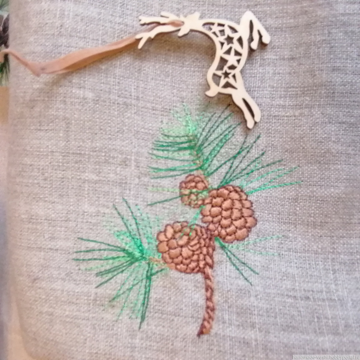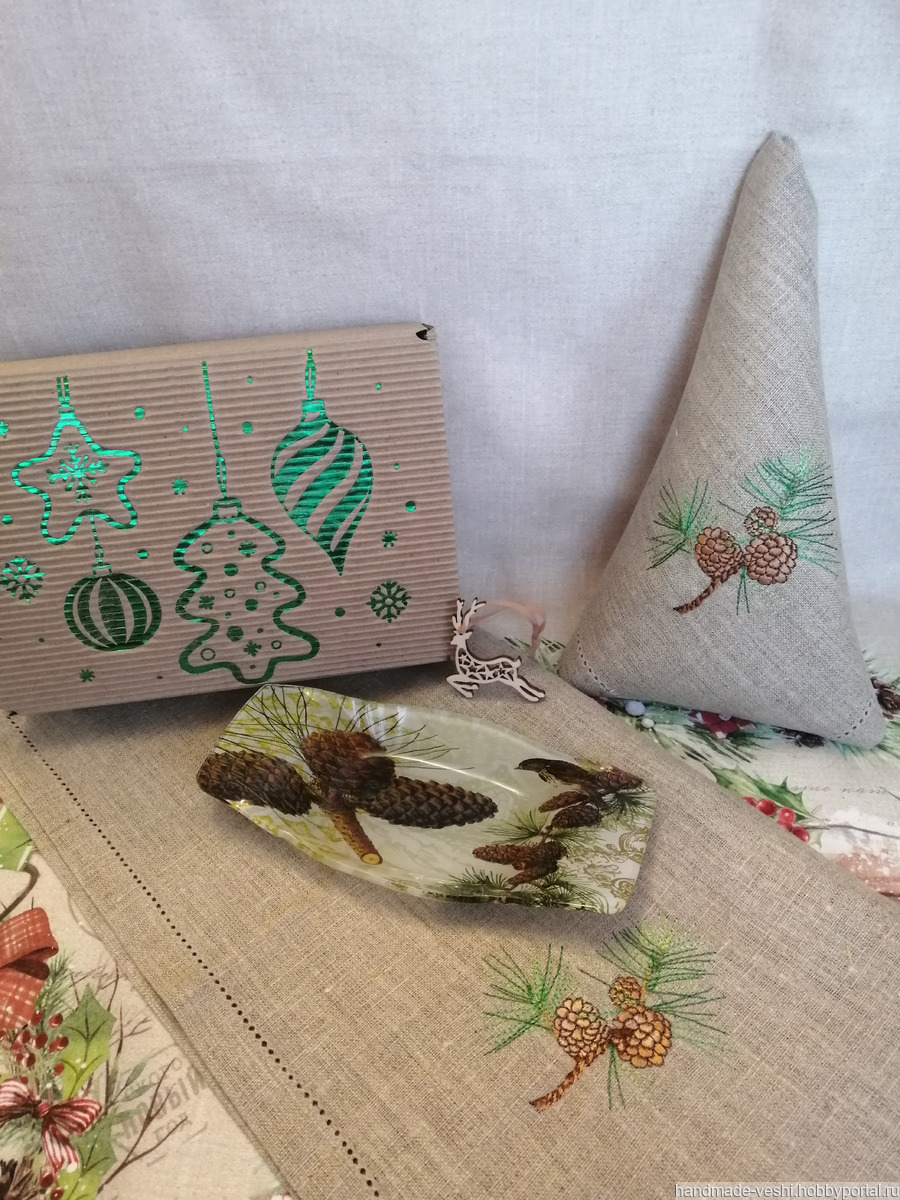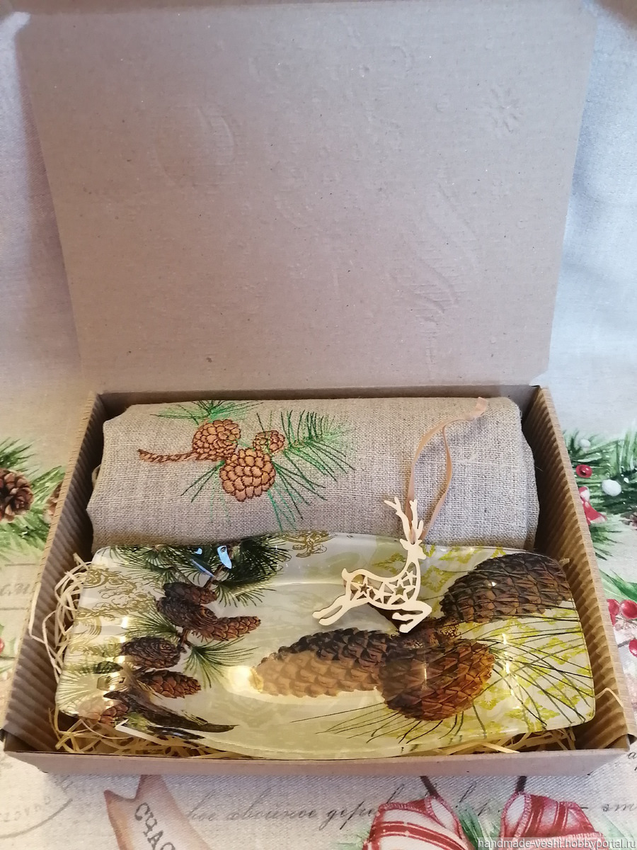 В состав набора входят салфетки льняные с вышивкой, размером 45х45- две штуки, одно блюдо из стекла, размером 18,5х8,5см, одна деревянная подвеска "Олень", коробка размером 21х15х5 см.