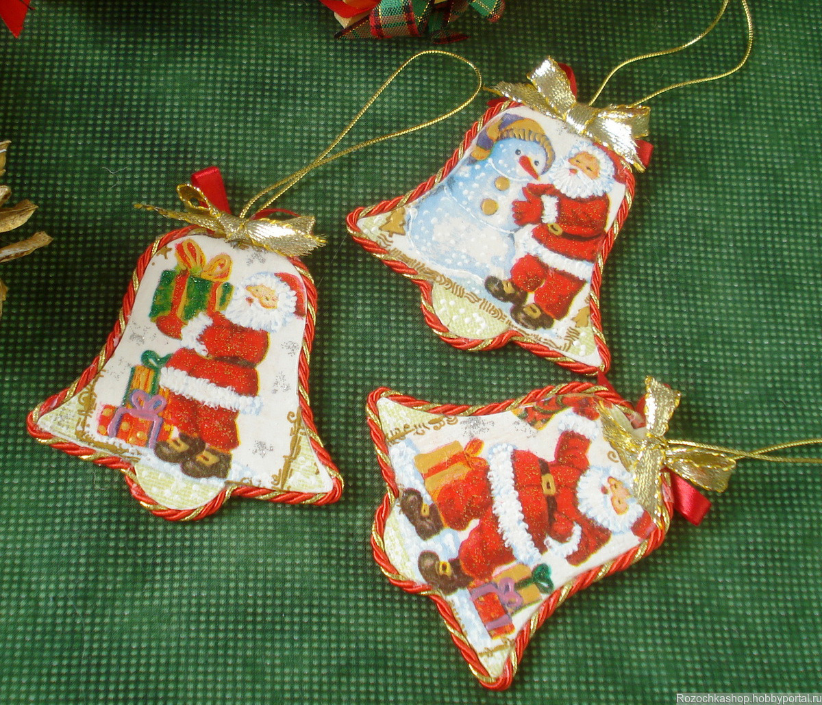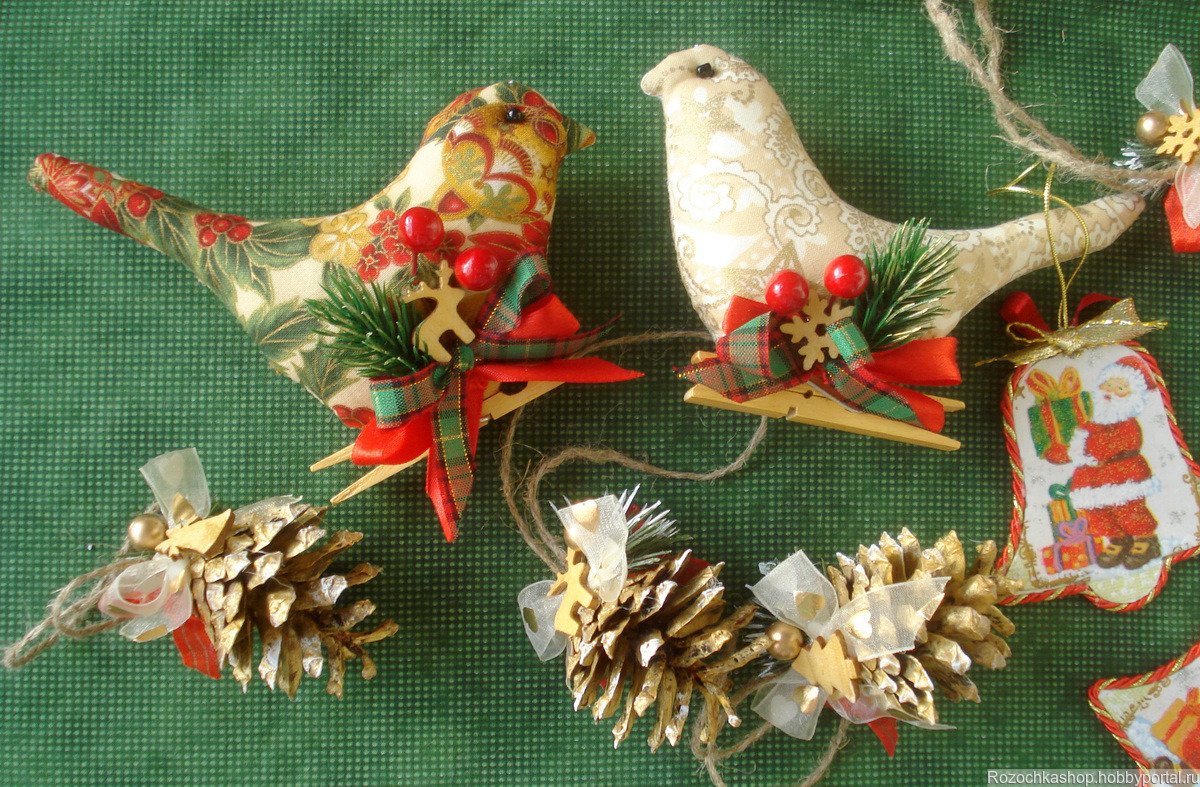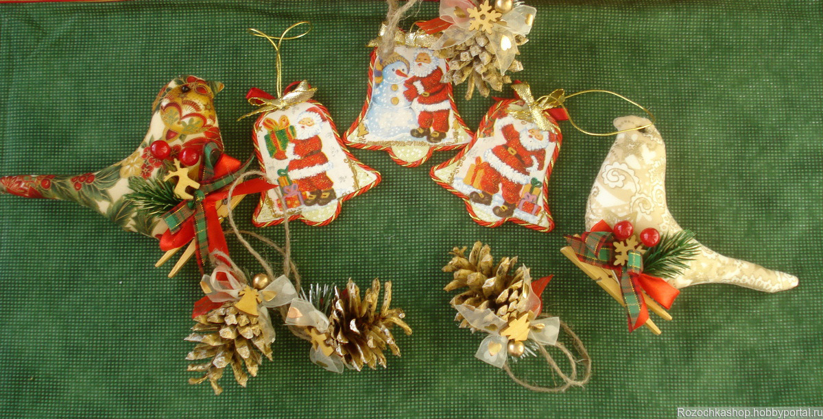 В яркий новогодний набор игрушек входят: четыре сосновых шишки + три подвески (деревянные заготовки, декупаж, декор) + две птички с деревянными прищепками для удобного крепления на веточки новогодней ёлки.