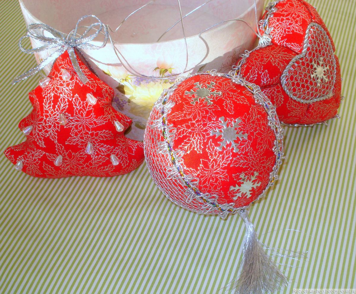 Яркий новогодний набор игрушек " Красное серебро" состоит из шарика, сердечка и ёлочки, выполненных из высококачественного хлопка. Украшены декоративными лентами, блестящим шнуром, красивой тесьмой , имеет петельку для подвешивания. Внутри пенопластовая основа. Текстильная ёлочка наполнена синтепухом.