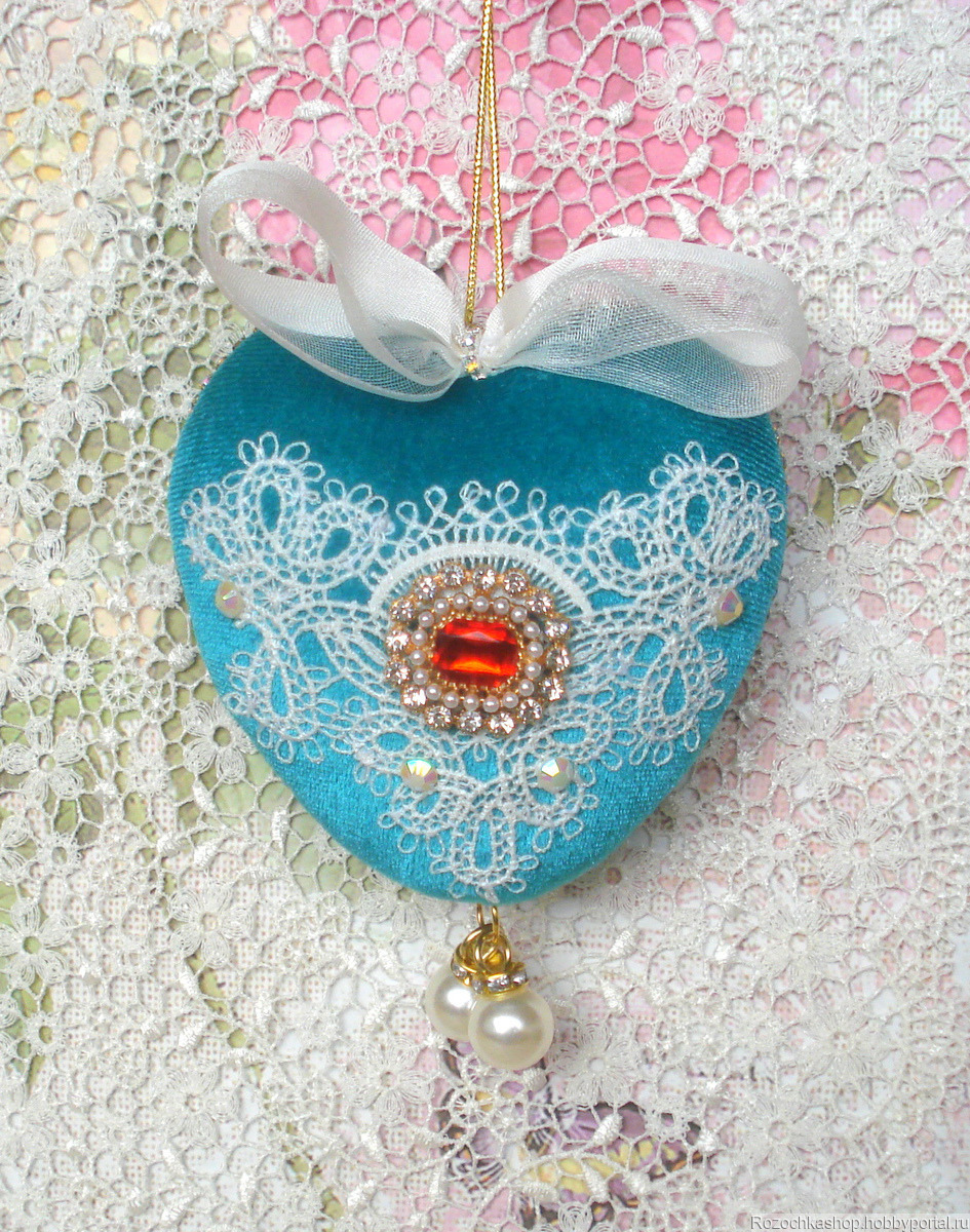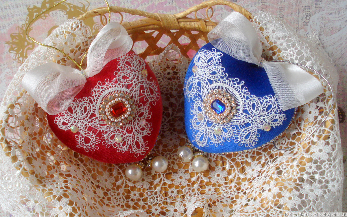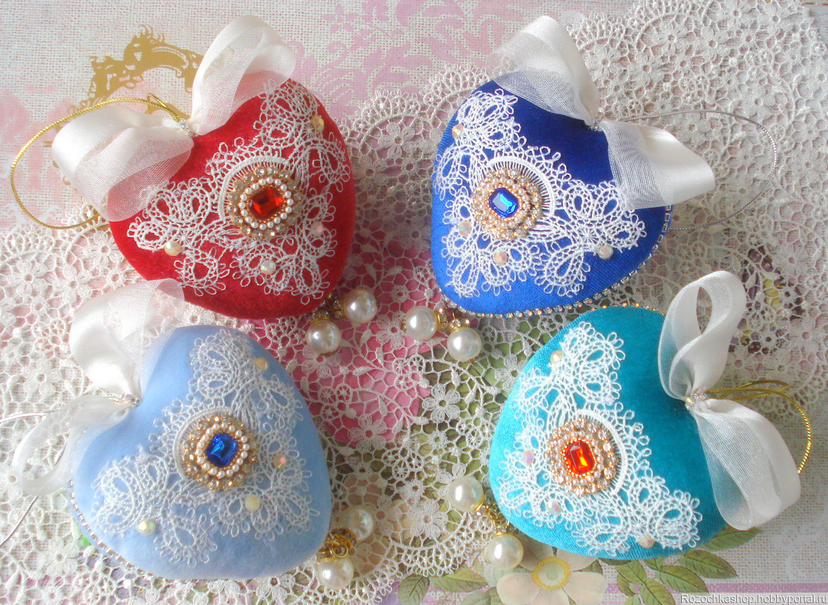 Пенопластовая основа обтянута стрейч-бархатом разных цветов. Украшены сердечки нежным кружевом, красивыми стразами, блестящей сеткой, шелковыми лентами, стразовой цепочкой и подвесками под жемчуг.