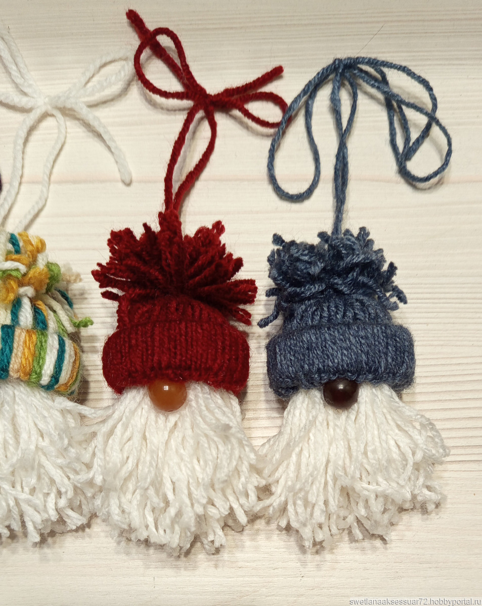 Подвеска гном изготовлена из пряжи. Высота гнома 11 см. Верёвочку можно завязать под нужную длину.