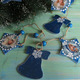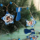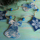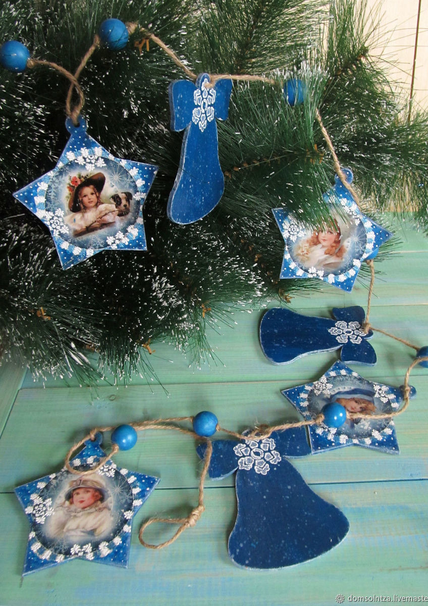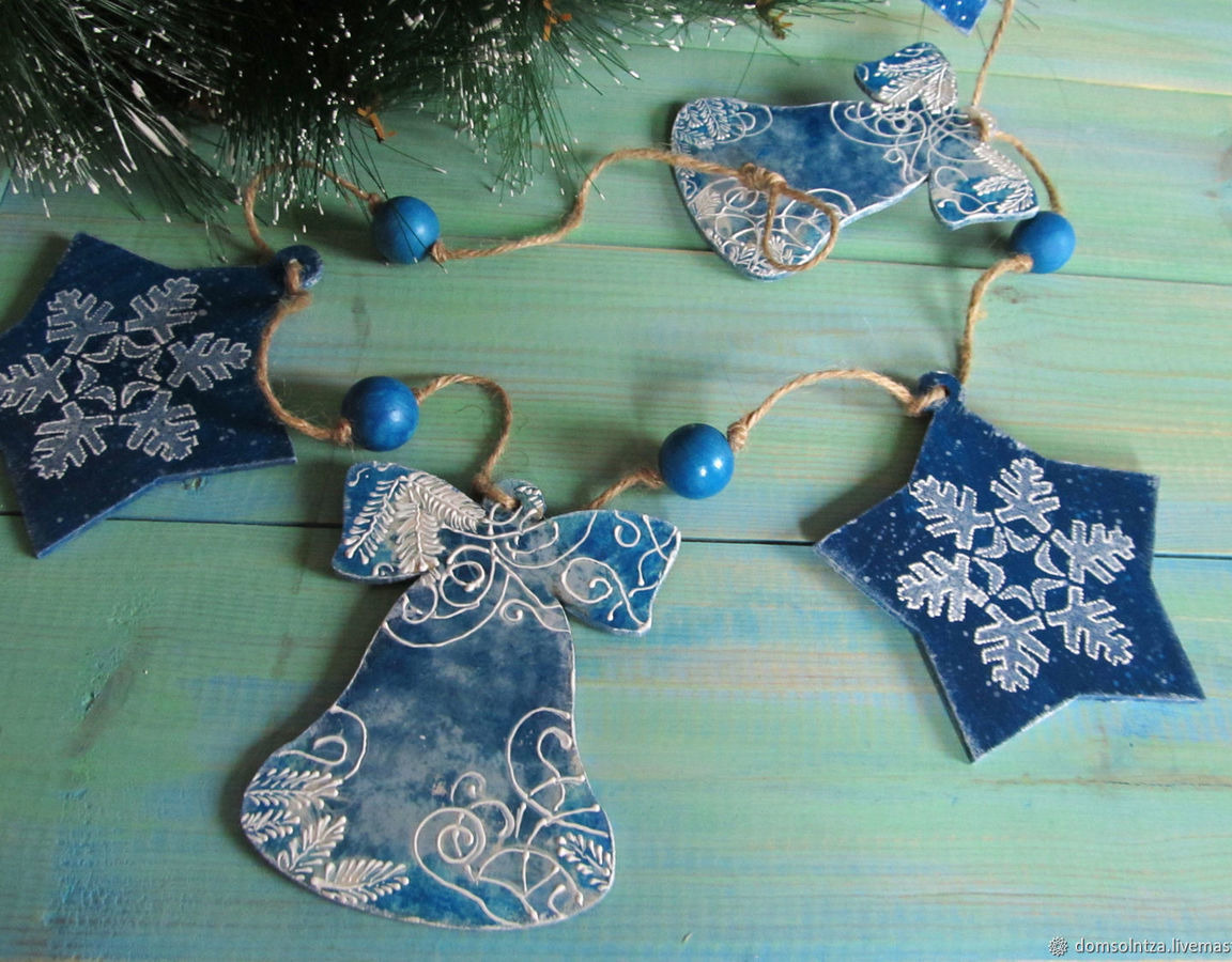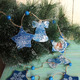 Семь подвесов в виде рождественских звезд и колокольчиков чередуются с небольшими голубыми бусинами.