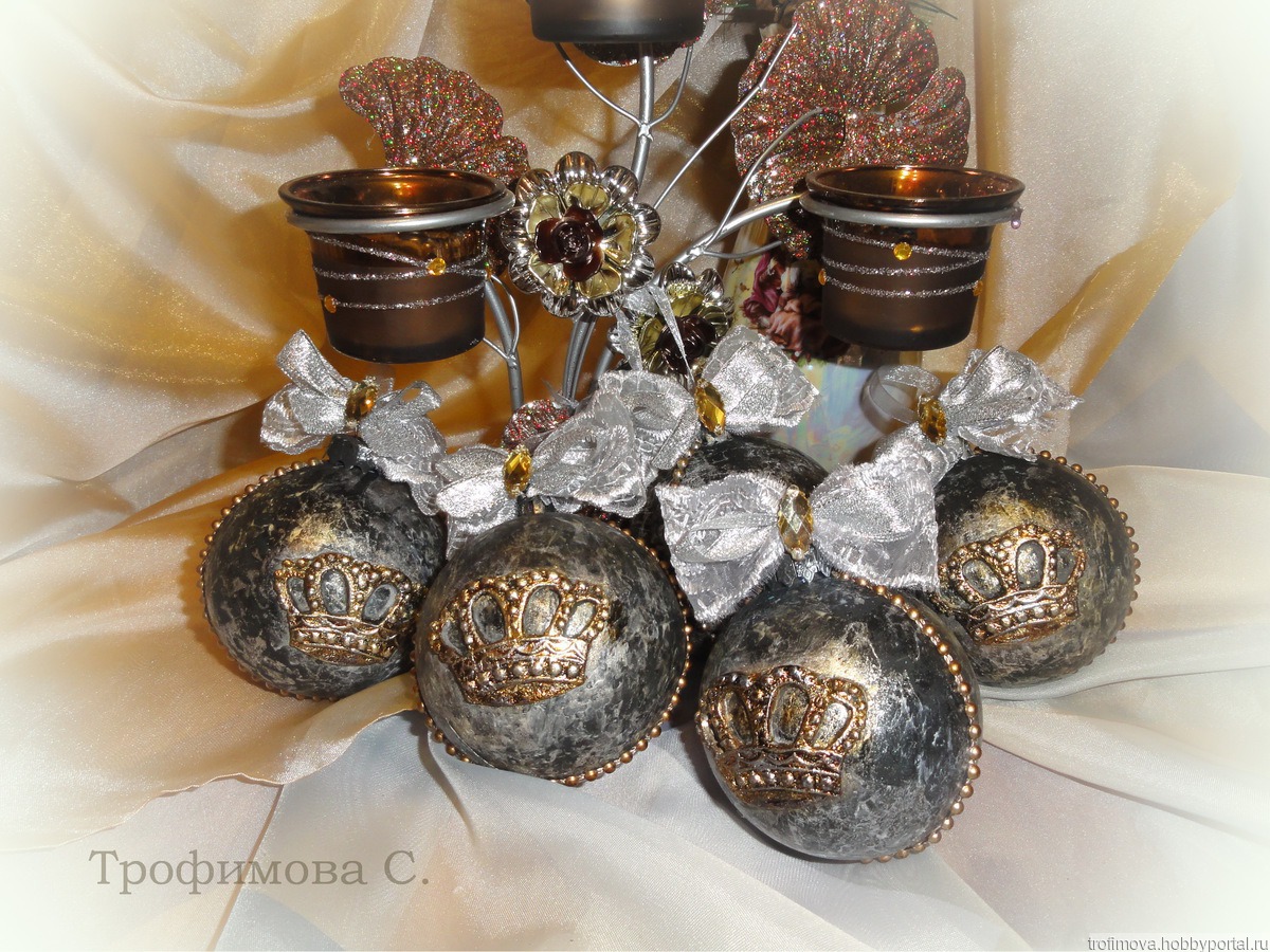 Какой же праздник без елки и новогодних украшений. Новогодние шары выполнены в стильной черно-серебряной гамме. По бокам декорированы цепочкой под золото,на переднем плане располагается декоративный элемент в виде короны, покрытый паталью. Поэтому он просто горит на черном фоне шара. Сверху шары украшены декоративной лентой. В набор входит 5 пластиковых шаров