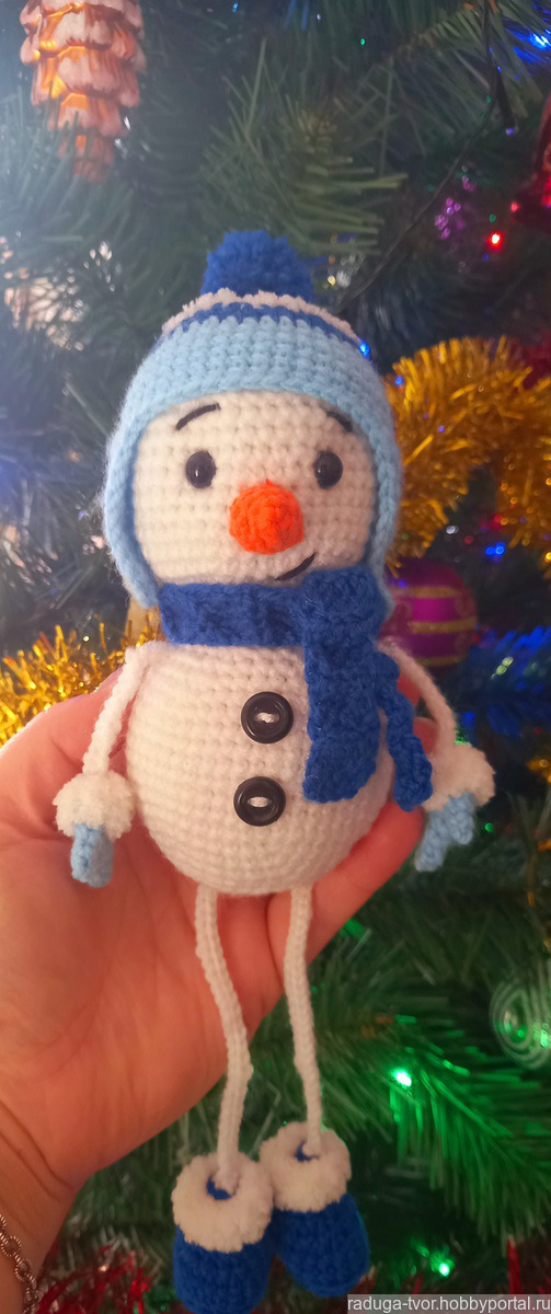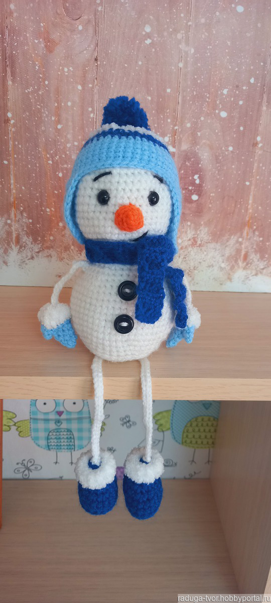 Снеговичок связан крючком. Шапочка и шарф снимаются. Игрушкой можно играть, а можно украсить новогодний интерьер, посадив на полочку. Поэтому можно подарить не только ребёнку, но и взрослому: маме, бабушке, тёте, крестной, девушке... Размер игрушки 27 см.