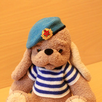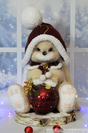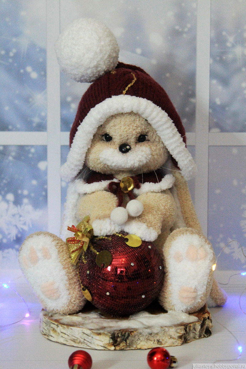 Декоративный плюшевый зайка с шаром. Игрушка выполнена спицами. Продается на подставке-березовый спил.