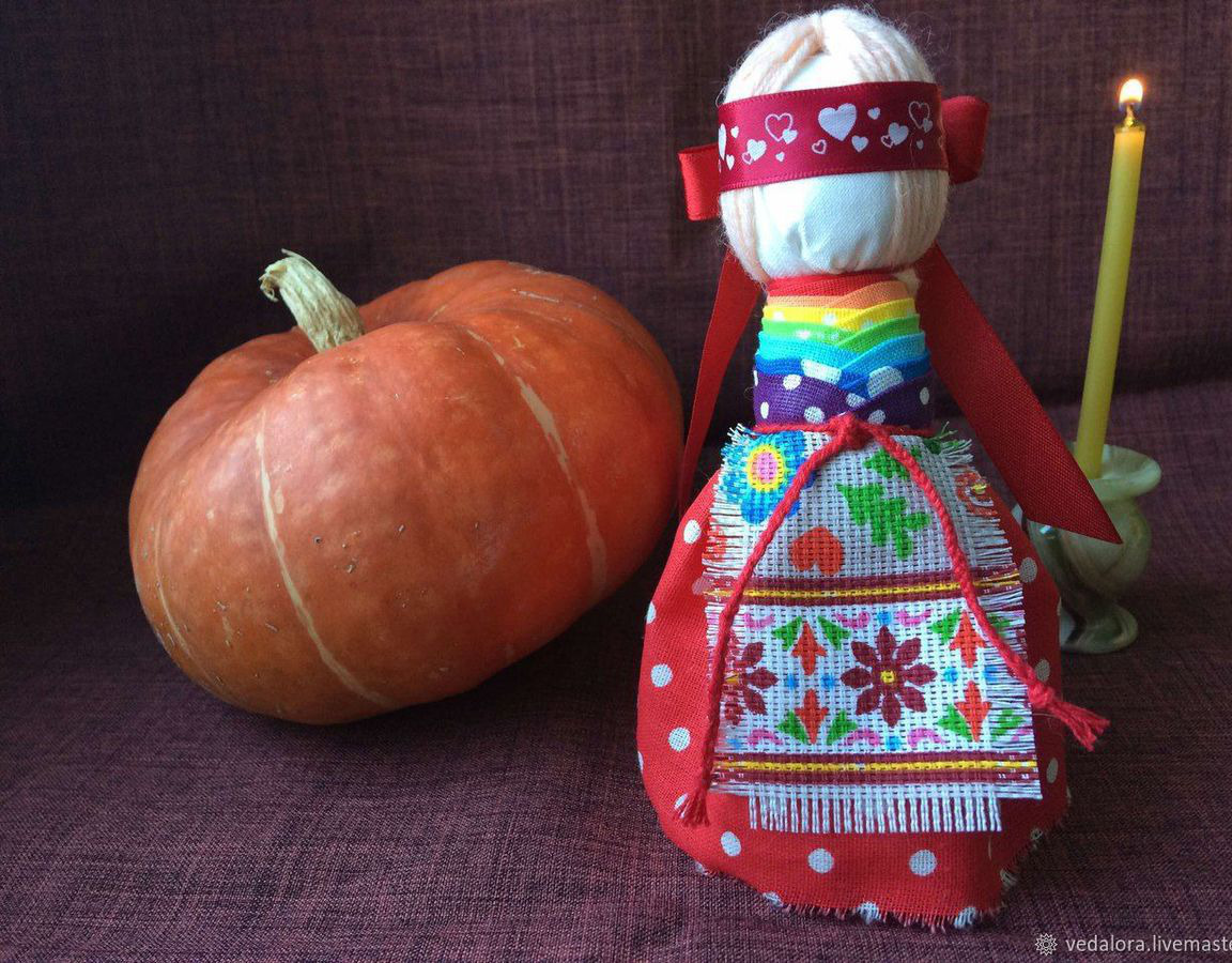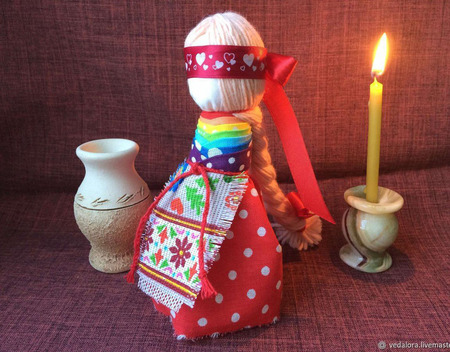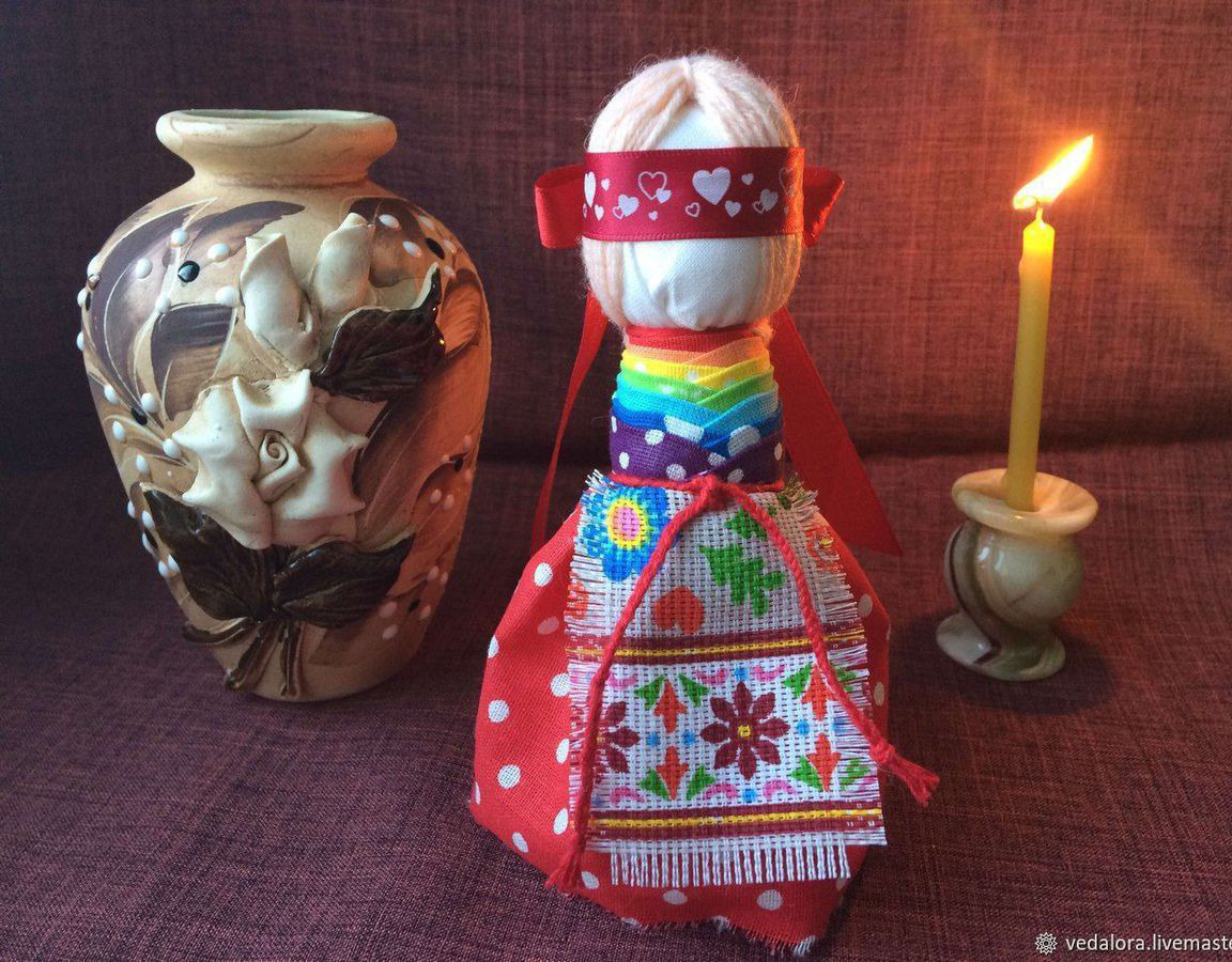 Нежная, яркая куколка оберег, для девушек, желающих удачно выйти замуж. Куколка помогает привлечь мужчину, построить и сохранить отношения с ним.